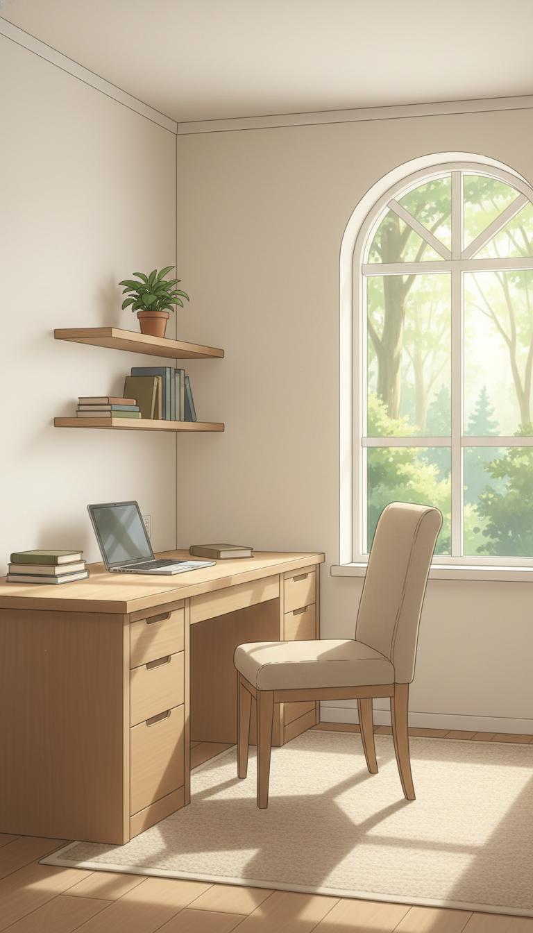 夕陽のミニマルオフィス|柔らかな光のスタイリッシュ書斎