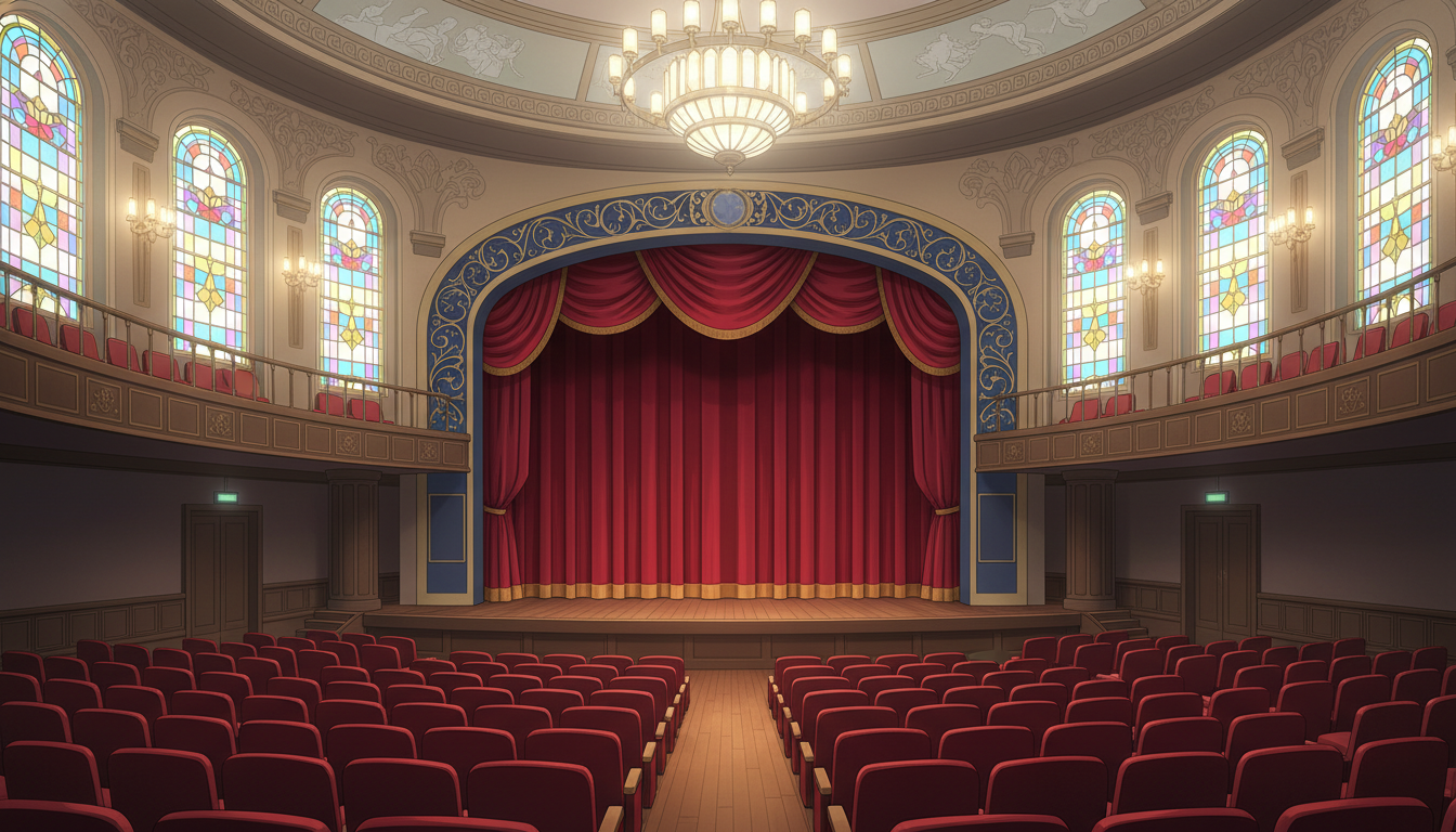 色鮮やかなステンドグラスと赤い幕が映える劇場背景です。