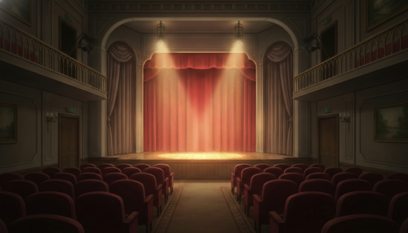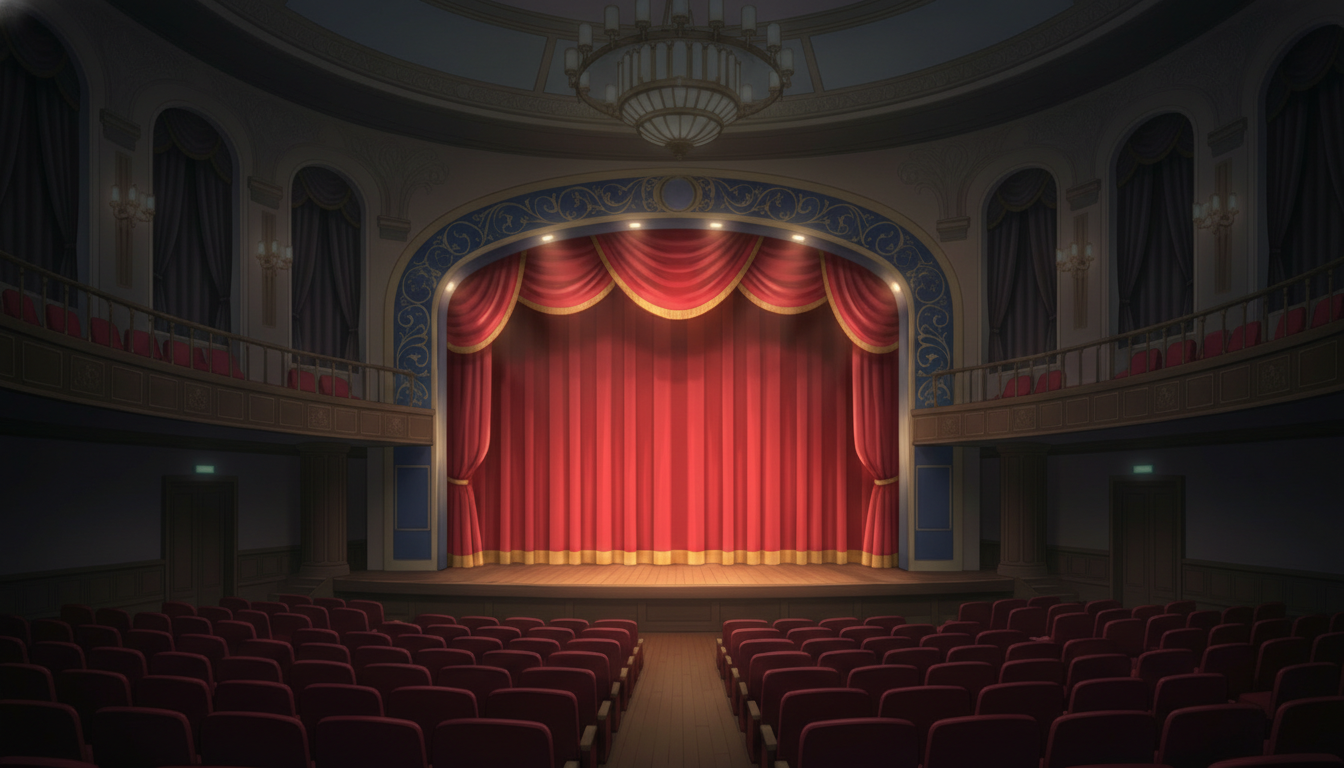 開演前の静けさを感じさせる、雰囲気重視の劇場背景イラストです。