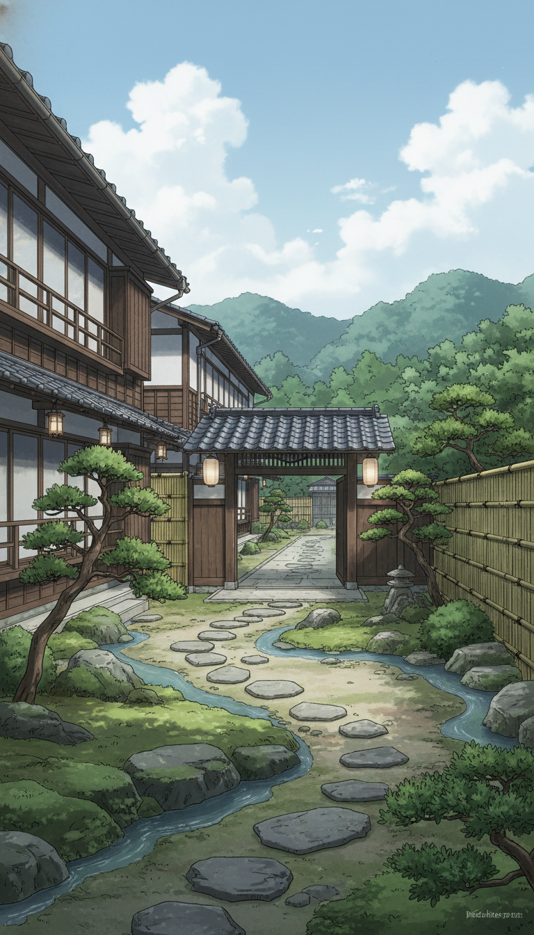 和風の旅館の背景イラスト素材を無料配布。9:16の縦長構図でスマホ作品に使いやすい背景イラストです。漫画・Webtoonやゲーム背景として商用・トレース利用もOK!