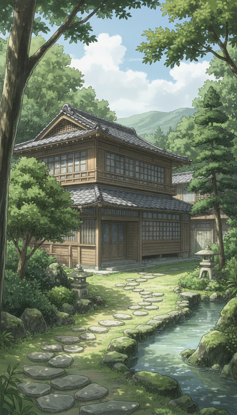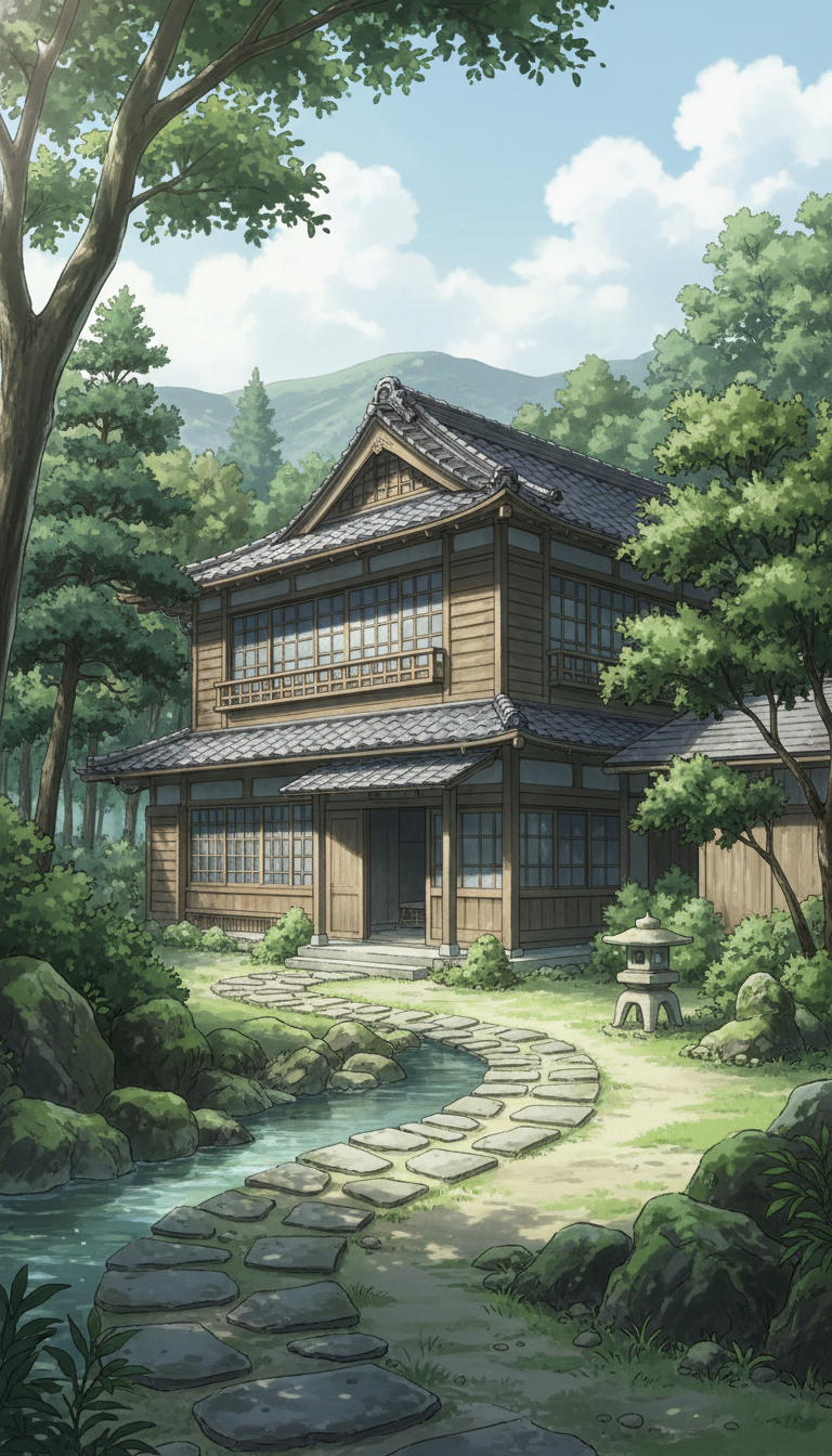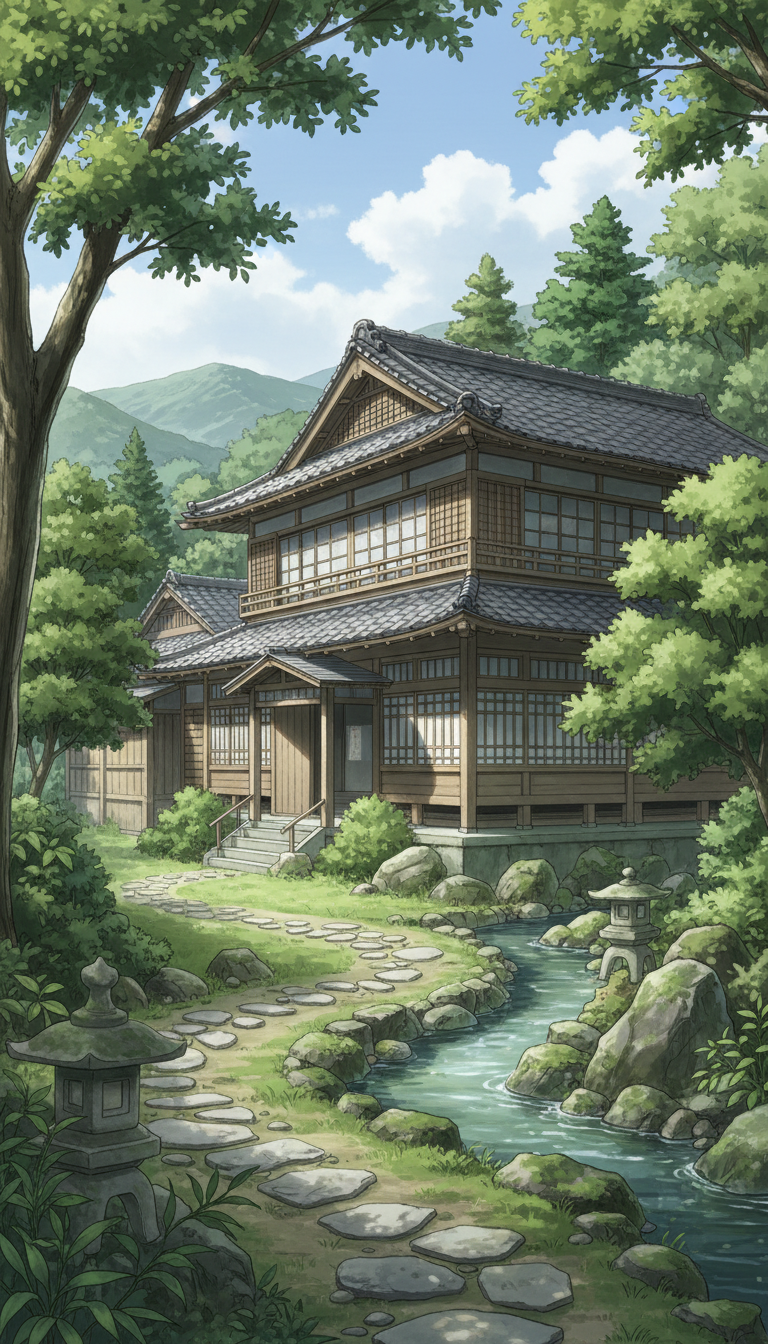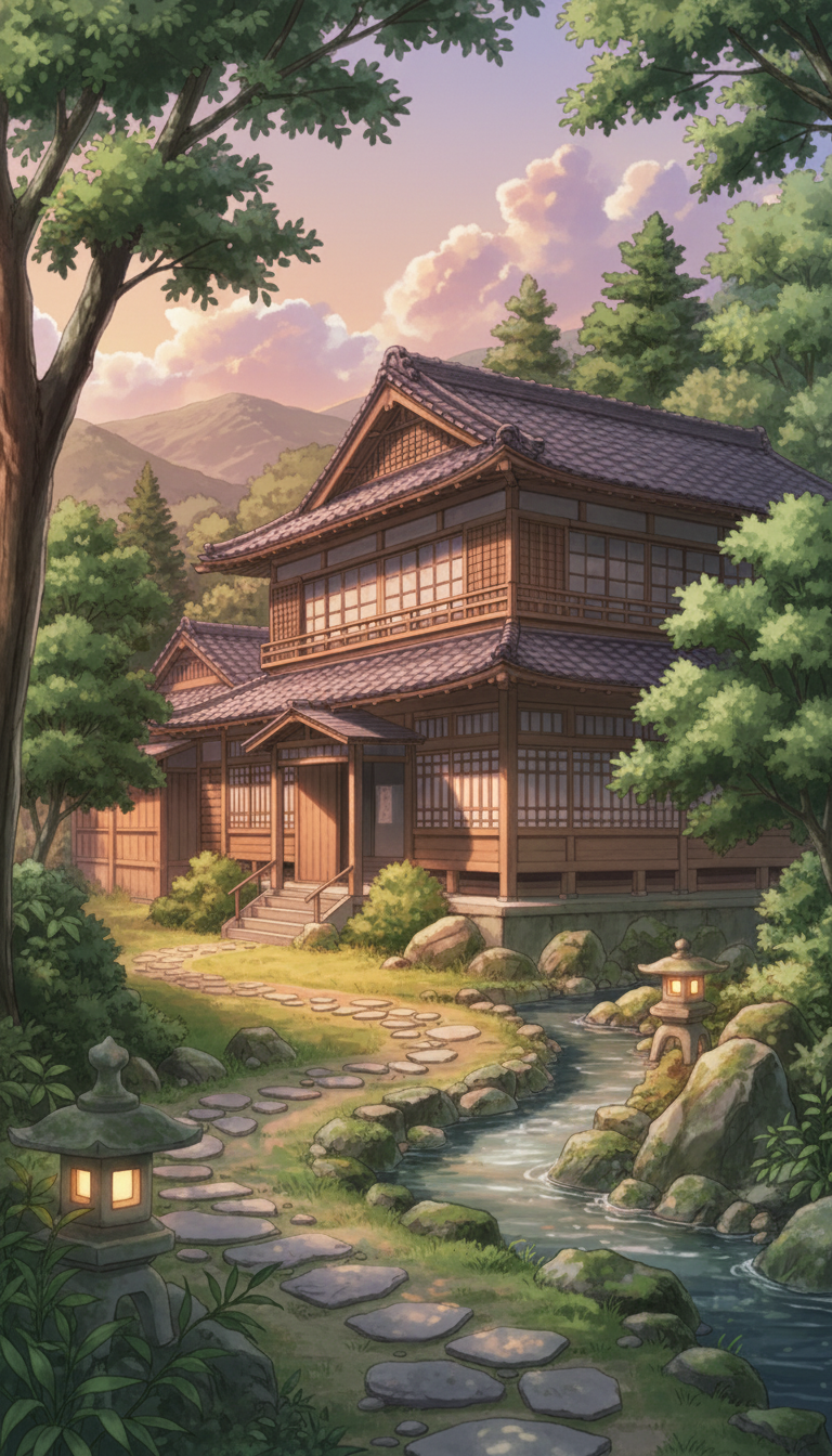 小川沿いの二階建て和風旅館|森の庭園背景イラスト