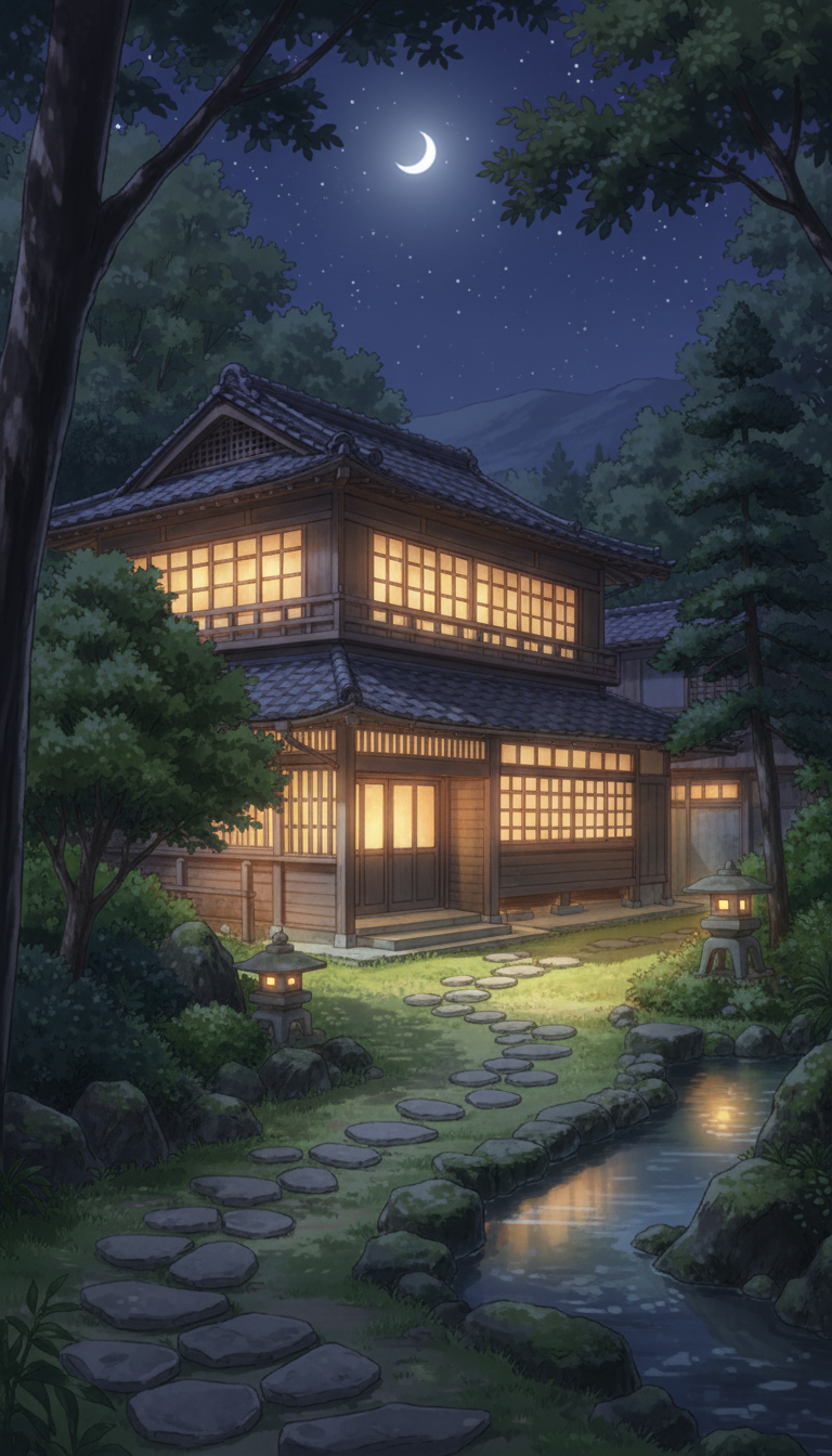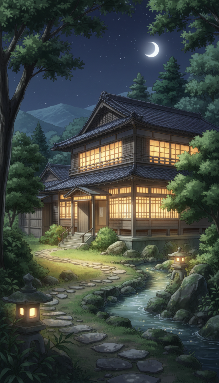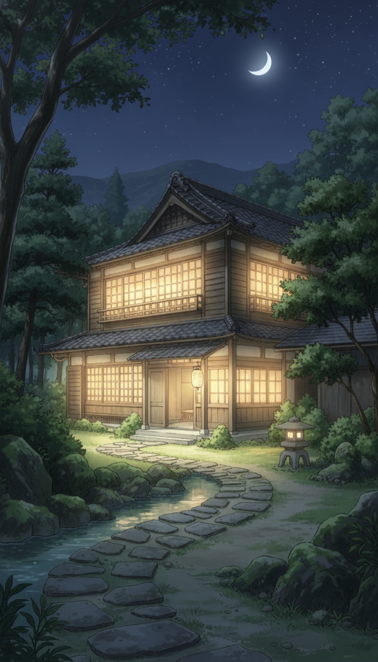 森に包まれた旅館の窓灯りと石灯籠が印象的な、深夜の宿泊シーンやしっとりした会話シーンに使いやすいナイト背景素材です。