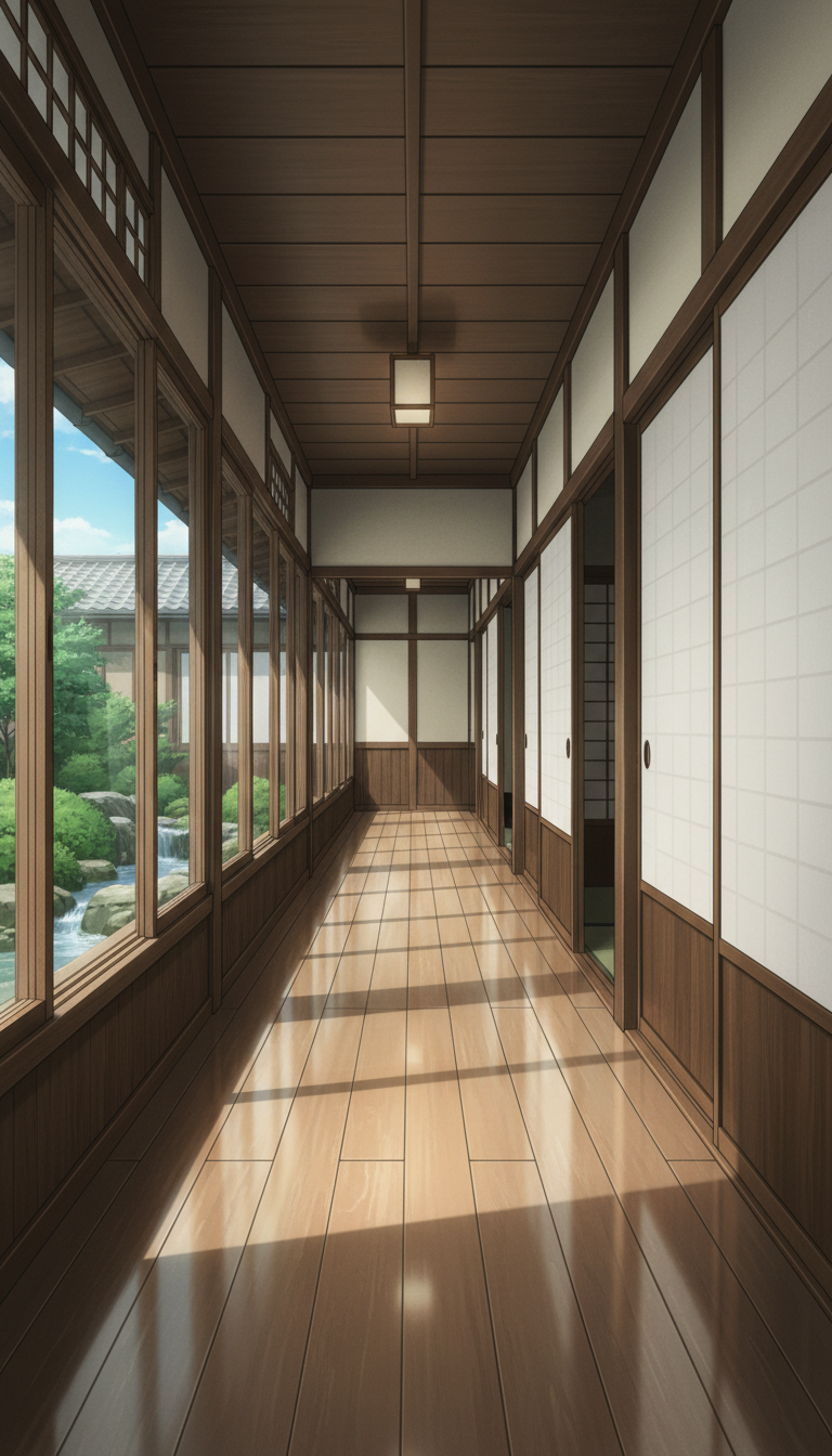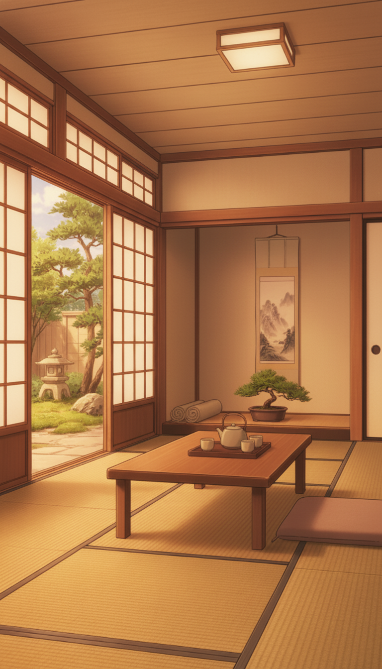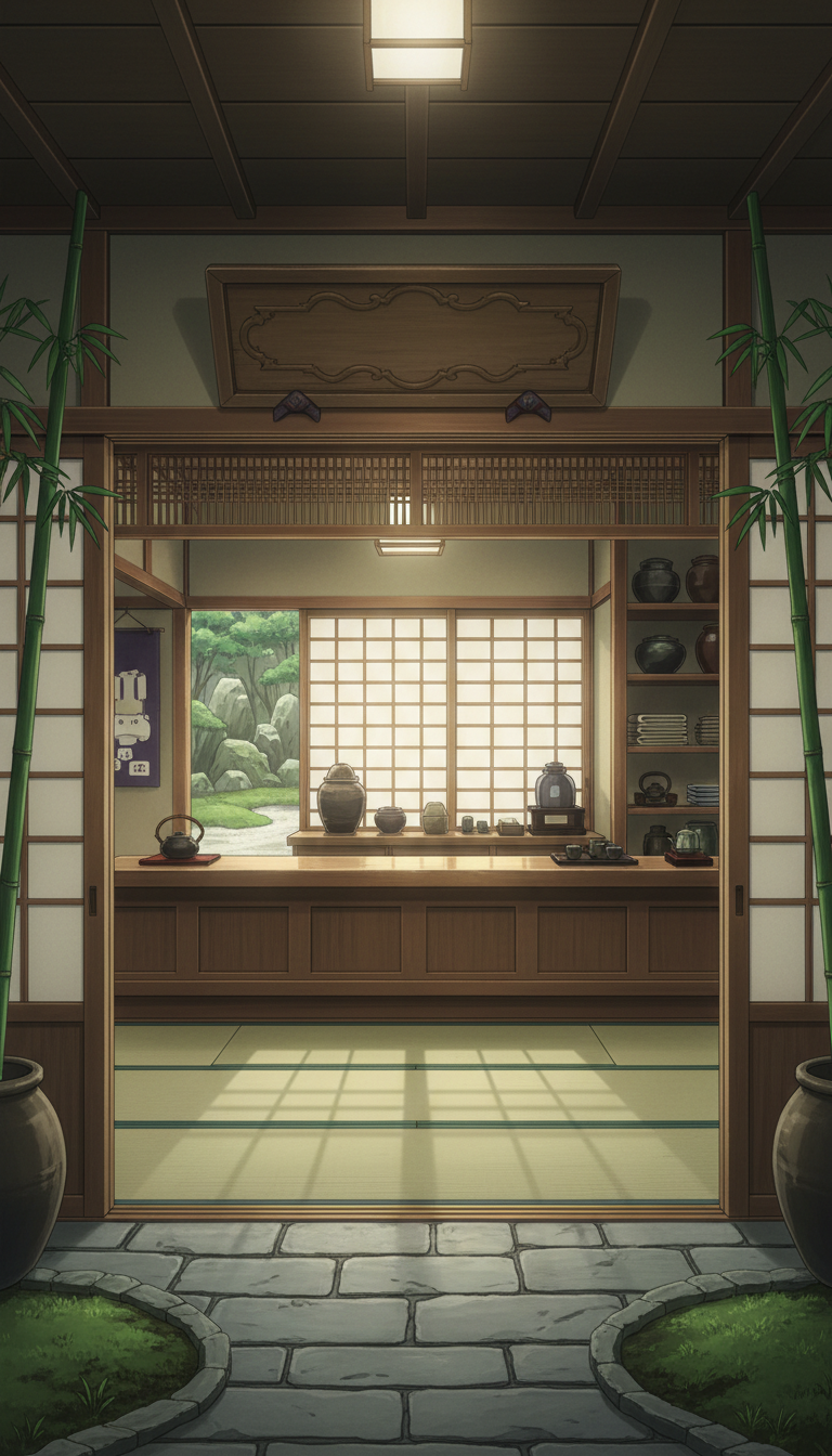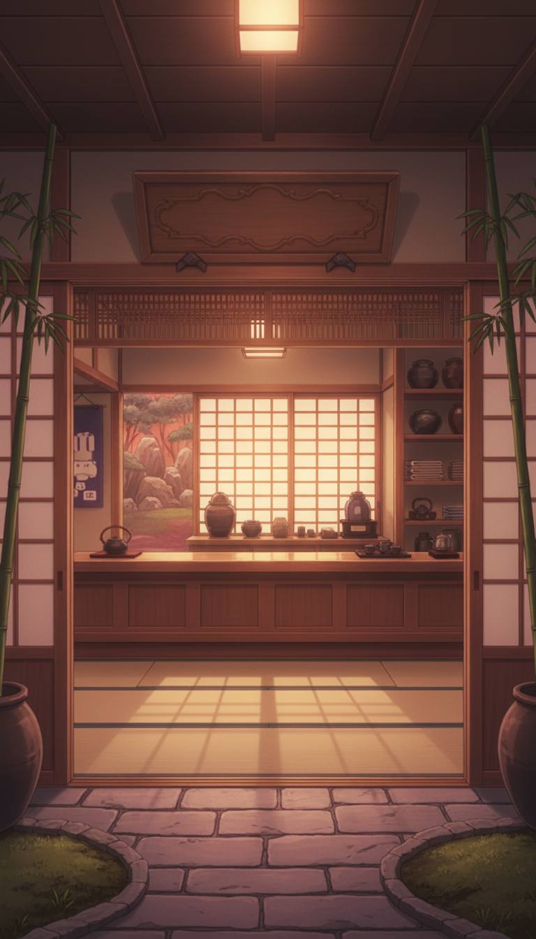 和風の旅館の背景イラスト素材を無料配布。9:16の縦長構図でスマホ作品に使いやすい背景イラストです。漫画・Webtoonやゲーム背景として商用・トレース利用もOK!