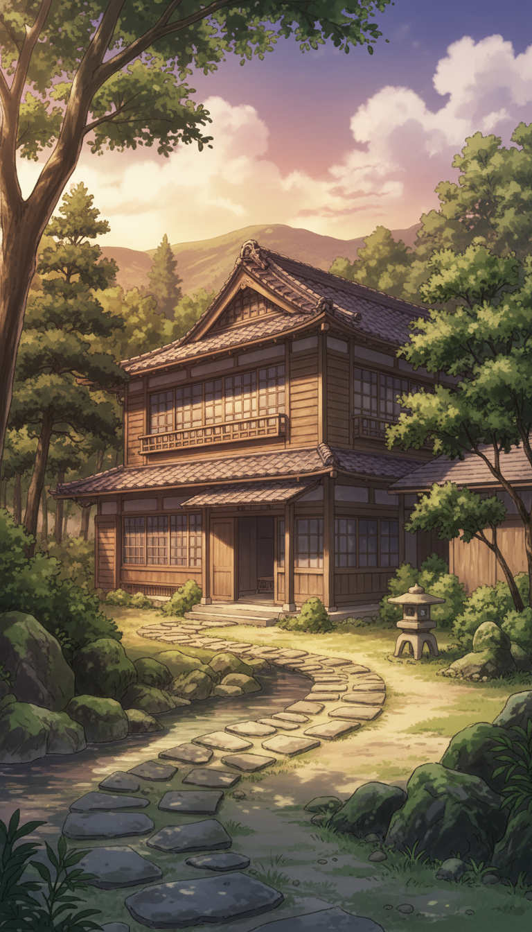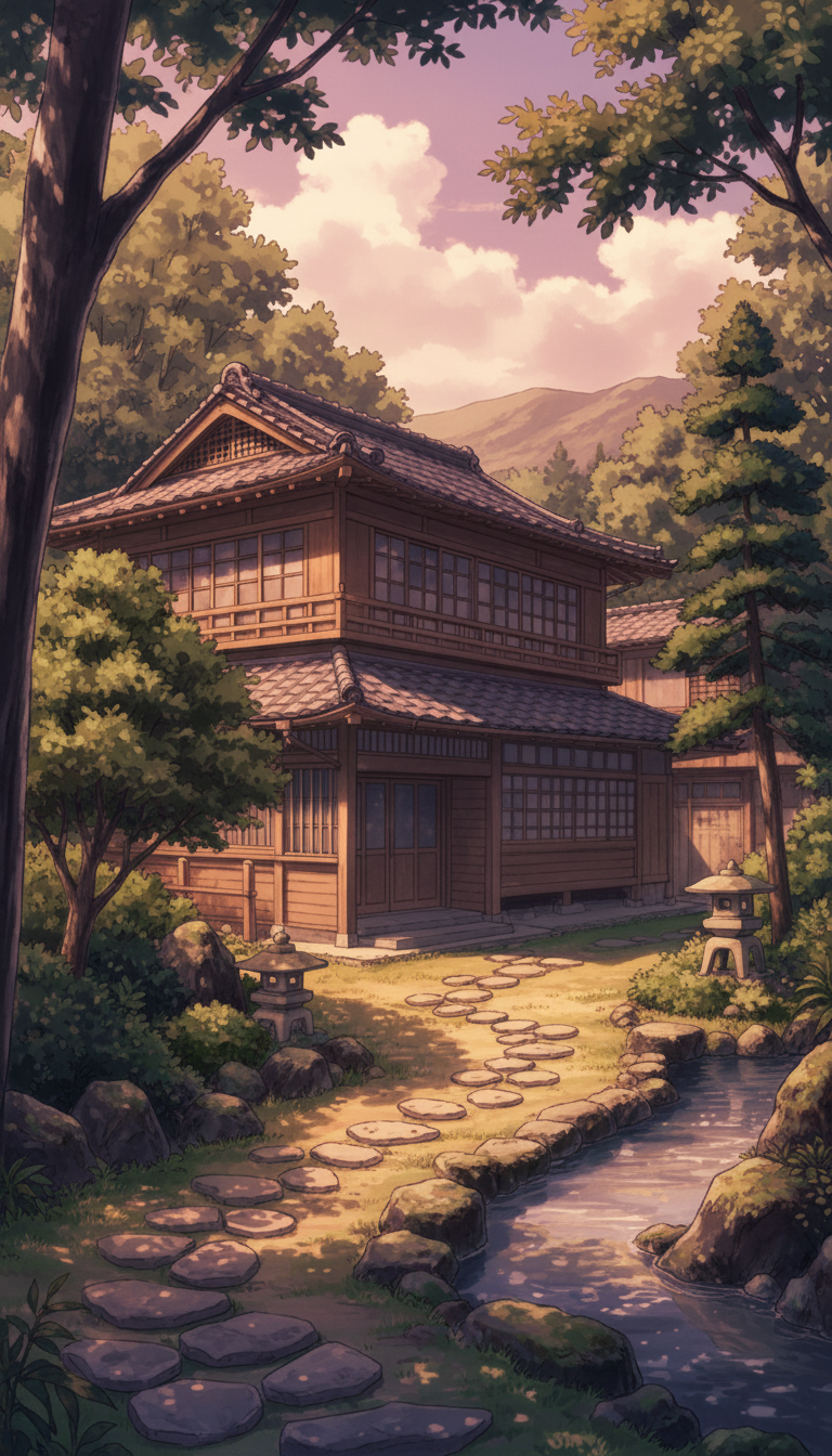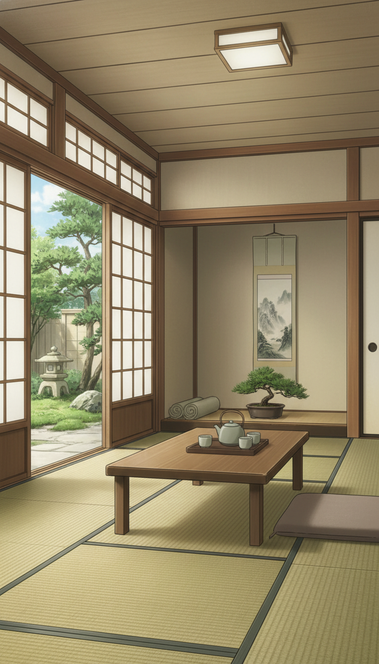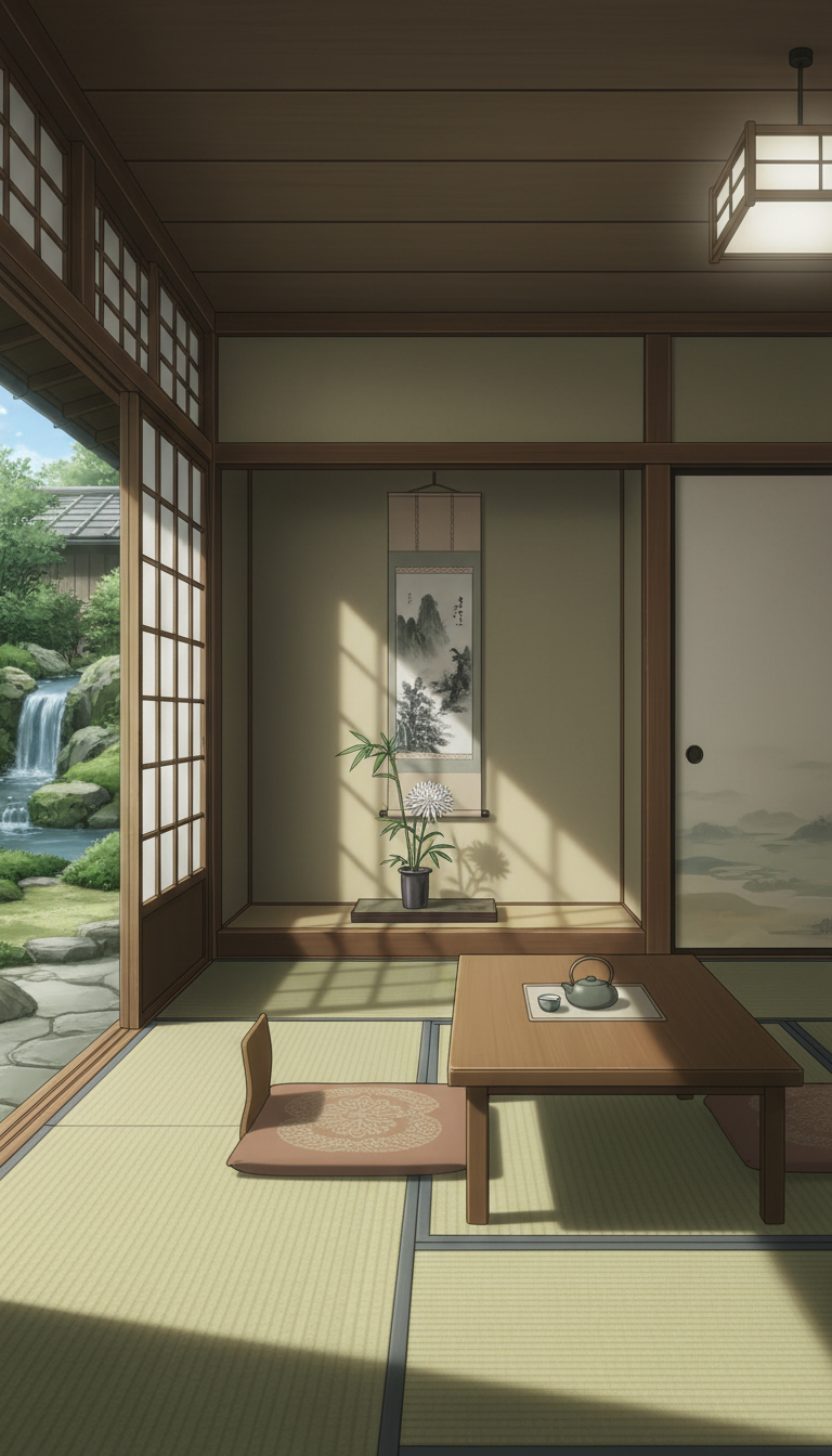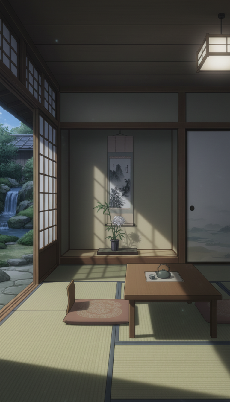 和風の旅館の背景イラスト素材を無料配布。9:16の縦長構図でスマホ作品に使いやすい背景イラストです。漫画・Webtoonやゲーム背景として商用・トレース利用もOK!