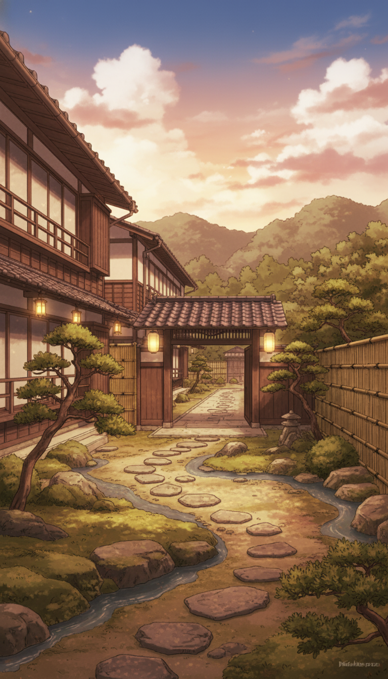 夕焼けに染まる旅館と灯籠の庭|黄昏シーン背景