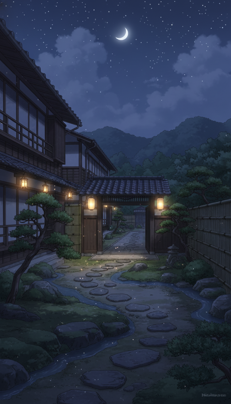 三日月と星空の下で旅館の窓明かりと石灯籠が輝く、夜の到着シーンや静かな語らいに最適な和風背景素材です。