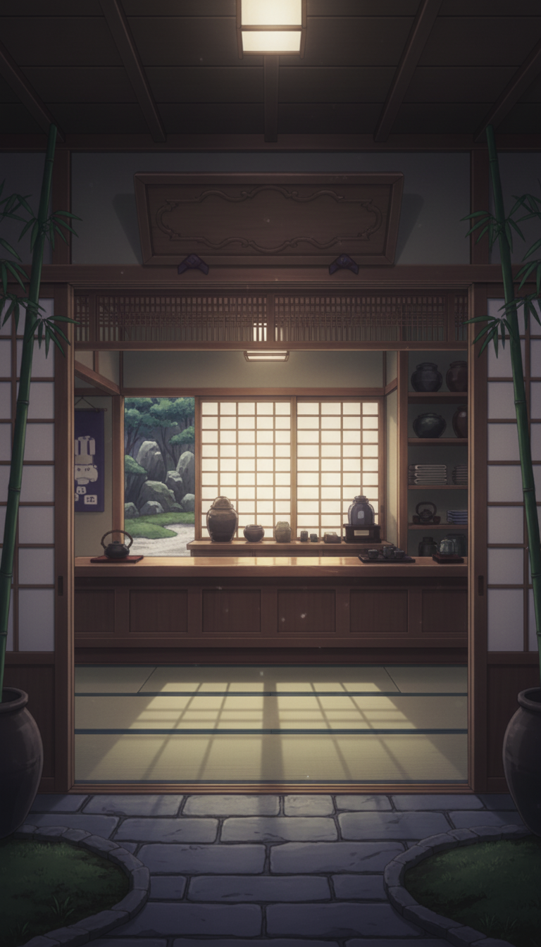 夜更けの帳場と静かな中庭|旅館受付ナイト背景