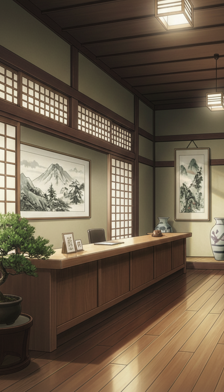 和風旅館のフロントカウンター|木造ロビー背景