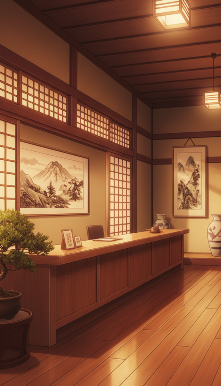 夕陽差し込む旅館フロント|チェックインシーン背景
