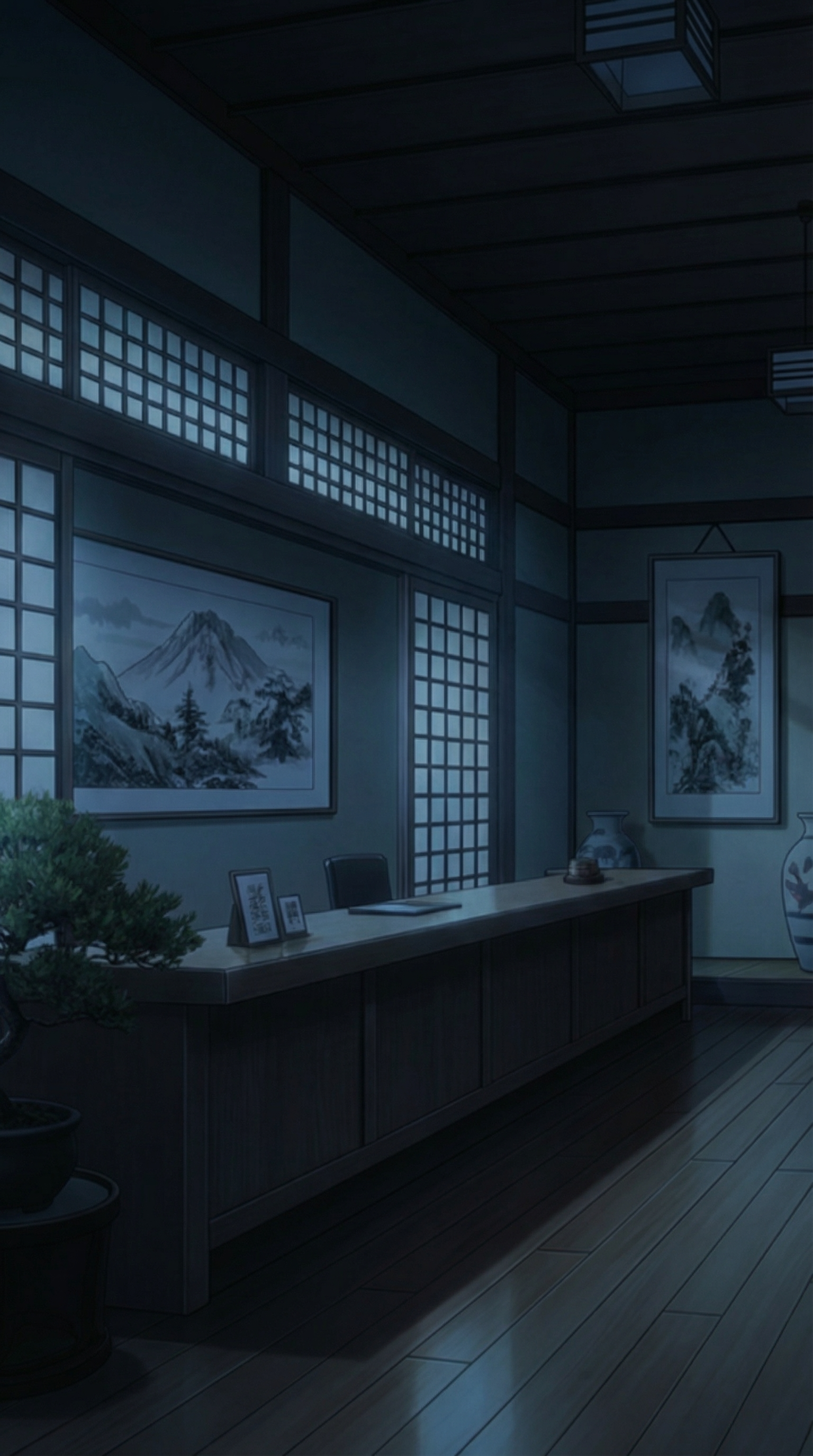 月明かりの旅館フロントカウンター|深夜ロビー背景
