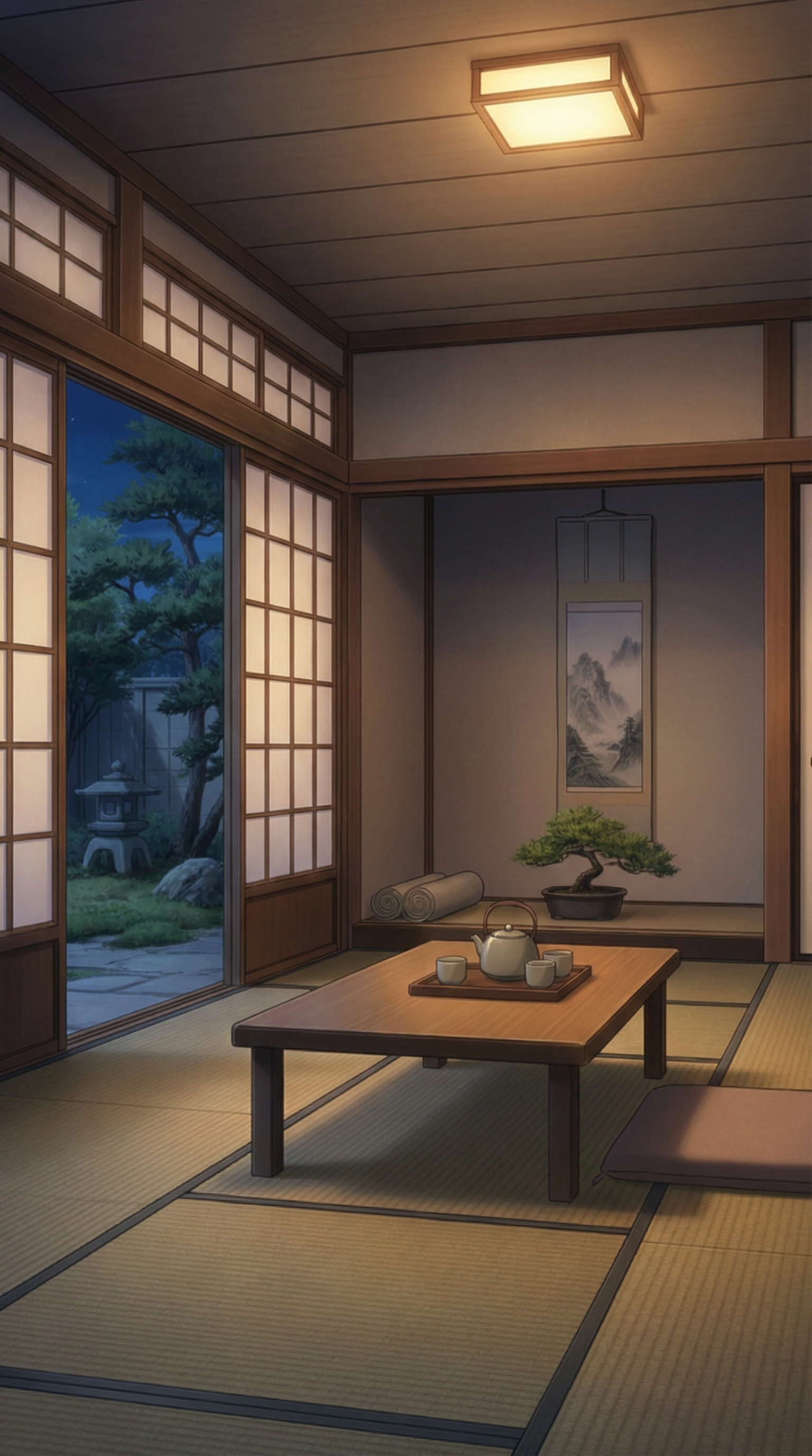 夜の静かな庭園を望む和室で、天井灯と障子越しの青い夜景が落ち着いた会話や就寝前シーンに最適な旅館客室背景素材です。