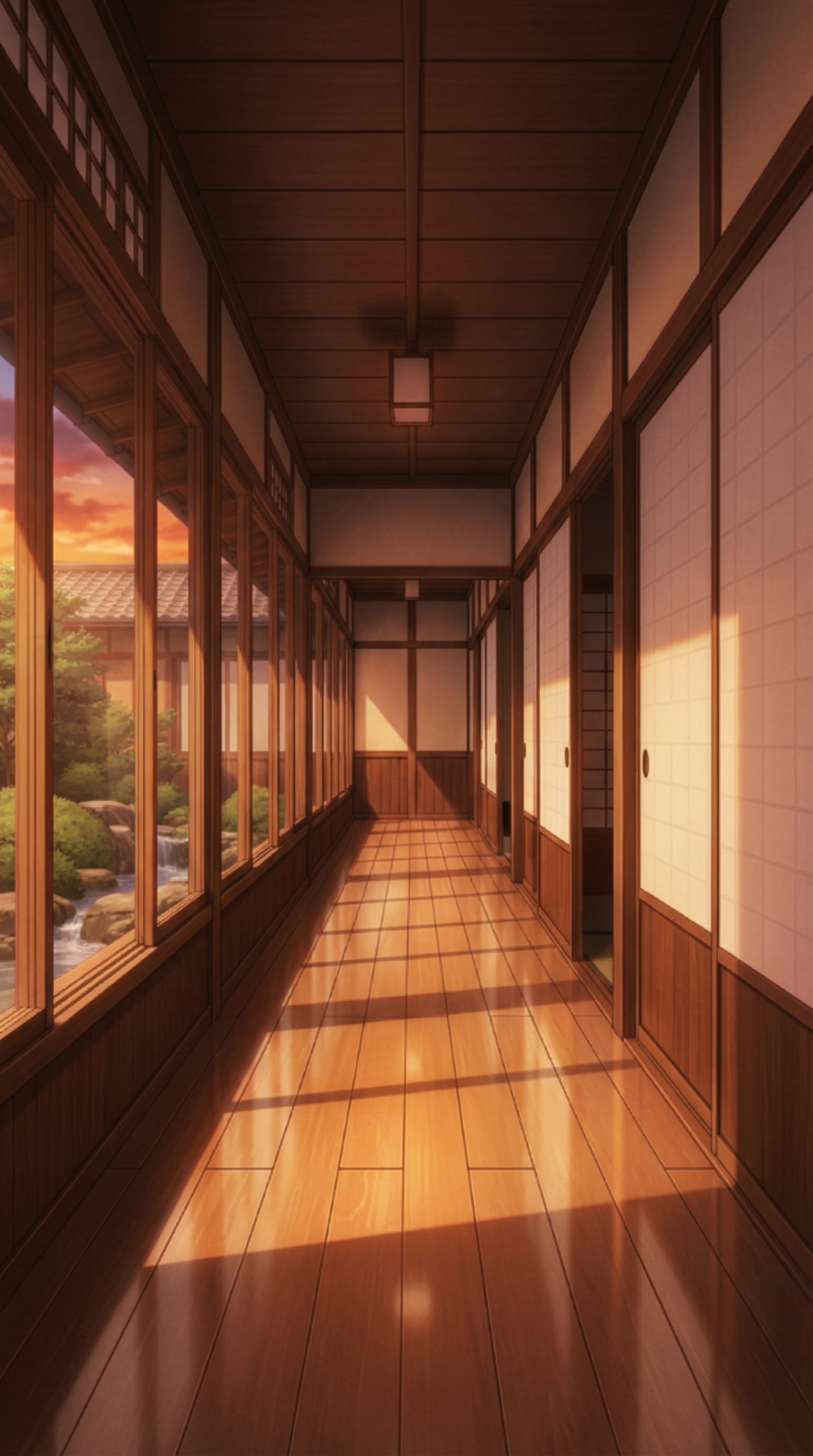 夕陽が窓から差し込み、渡り廊下の床と障子を温かく照らす、黄昏の移動シーンに使いやすい和風旅館回廊の背景素材です。
