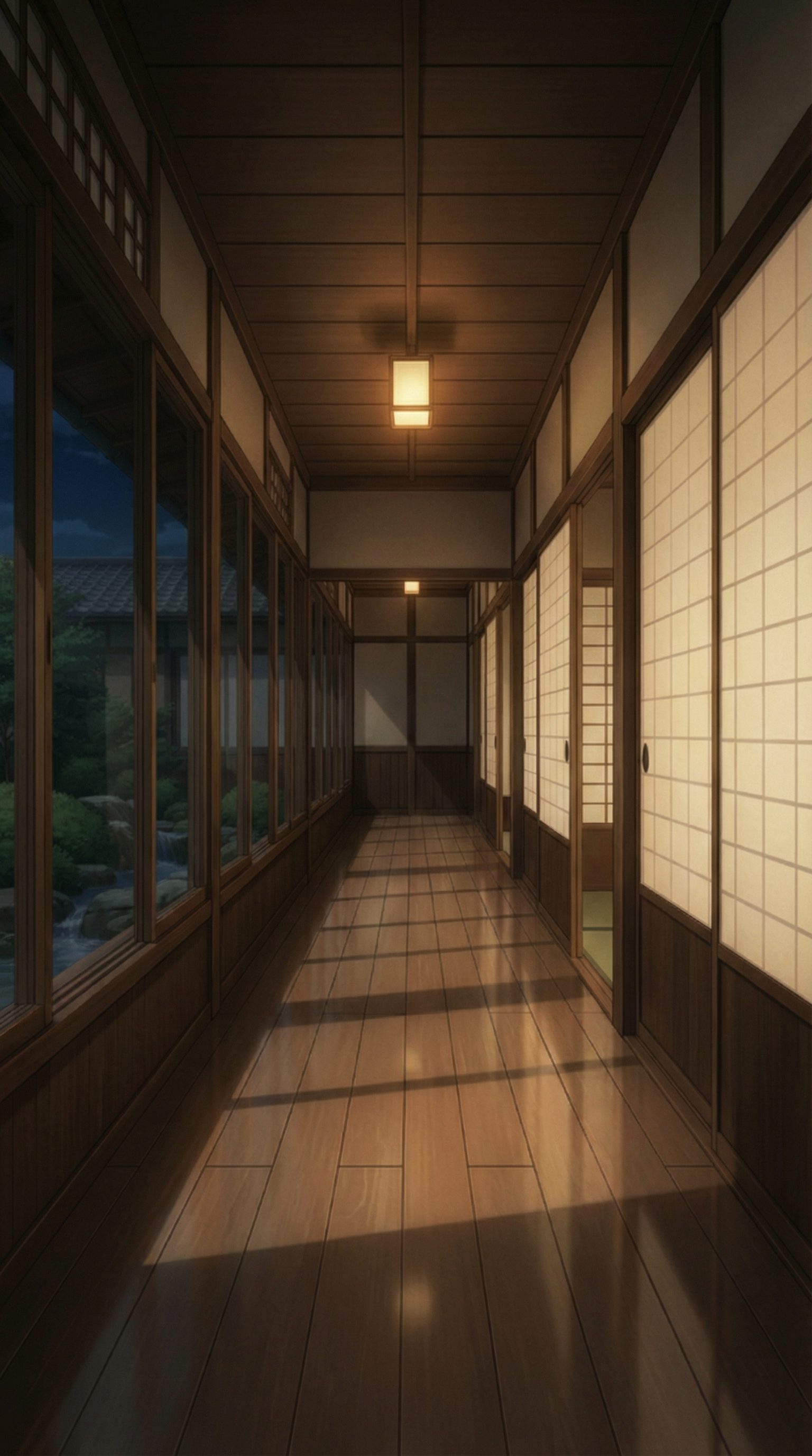 行灯の灯りと夜の庭園がガラス越しに揺らめく、深夜の見回りや密談シーンに最適な和風旅館の廊下背景素材です。