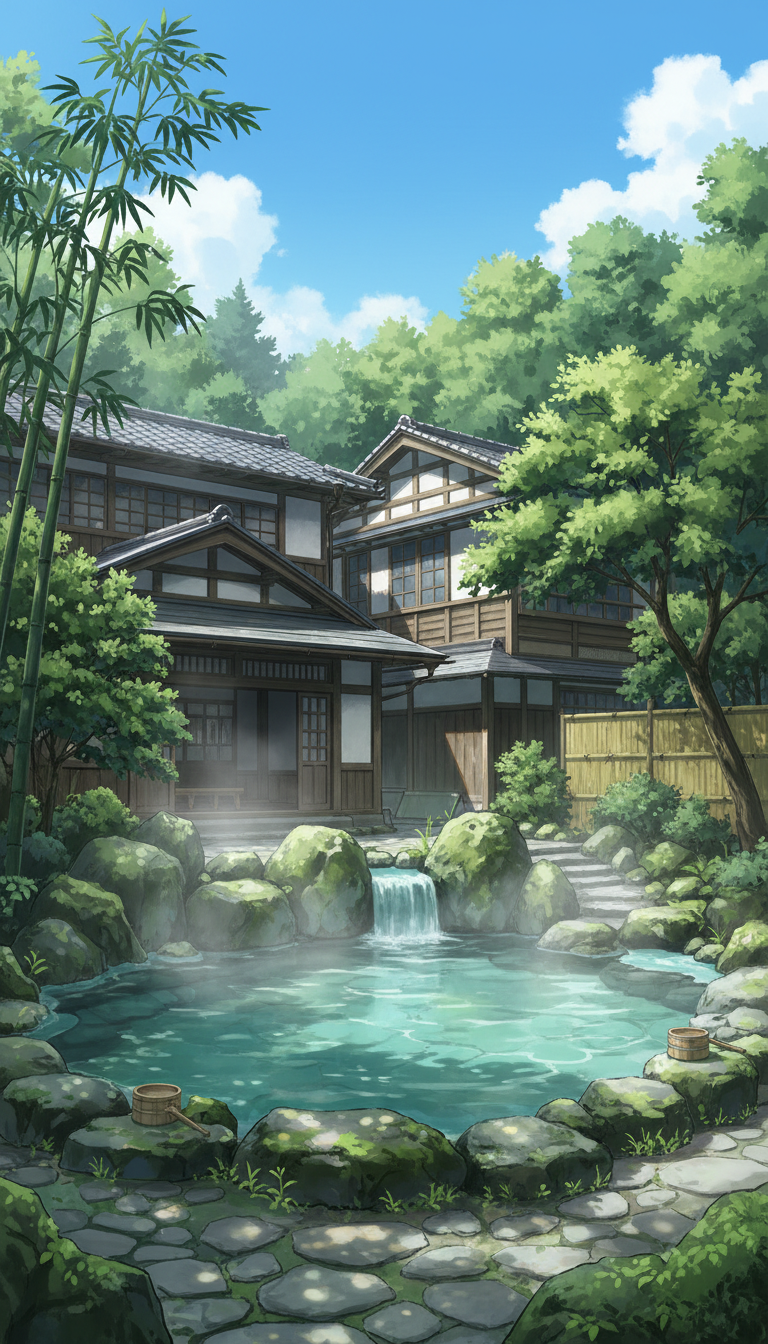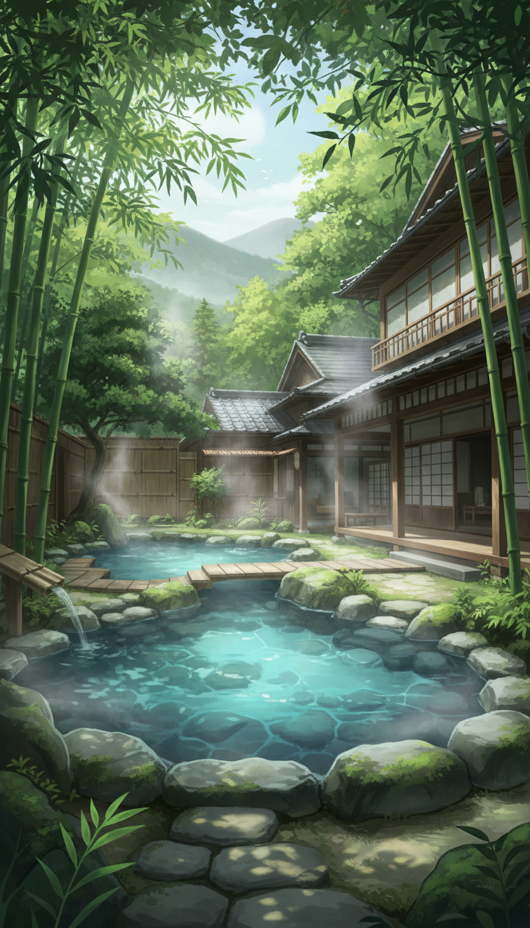 竹林に囲まれた旅館の露天風呂|昼の温泉庭園背景