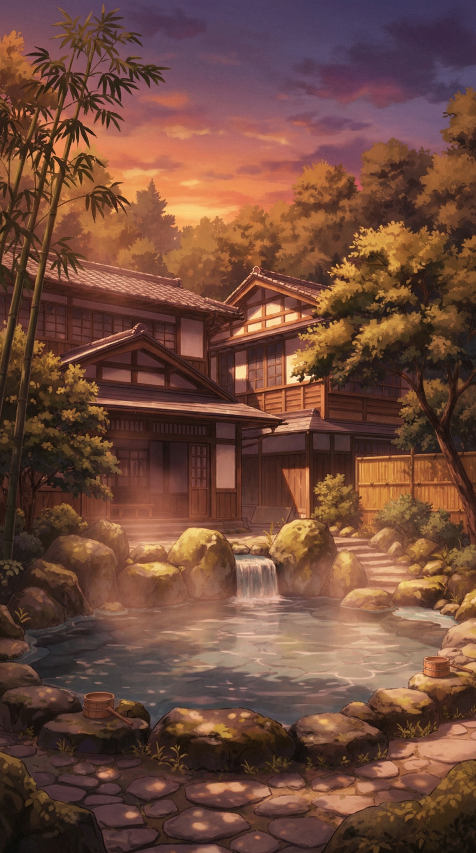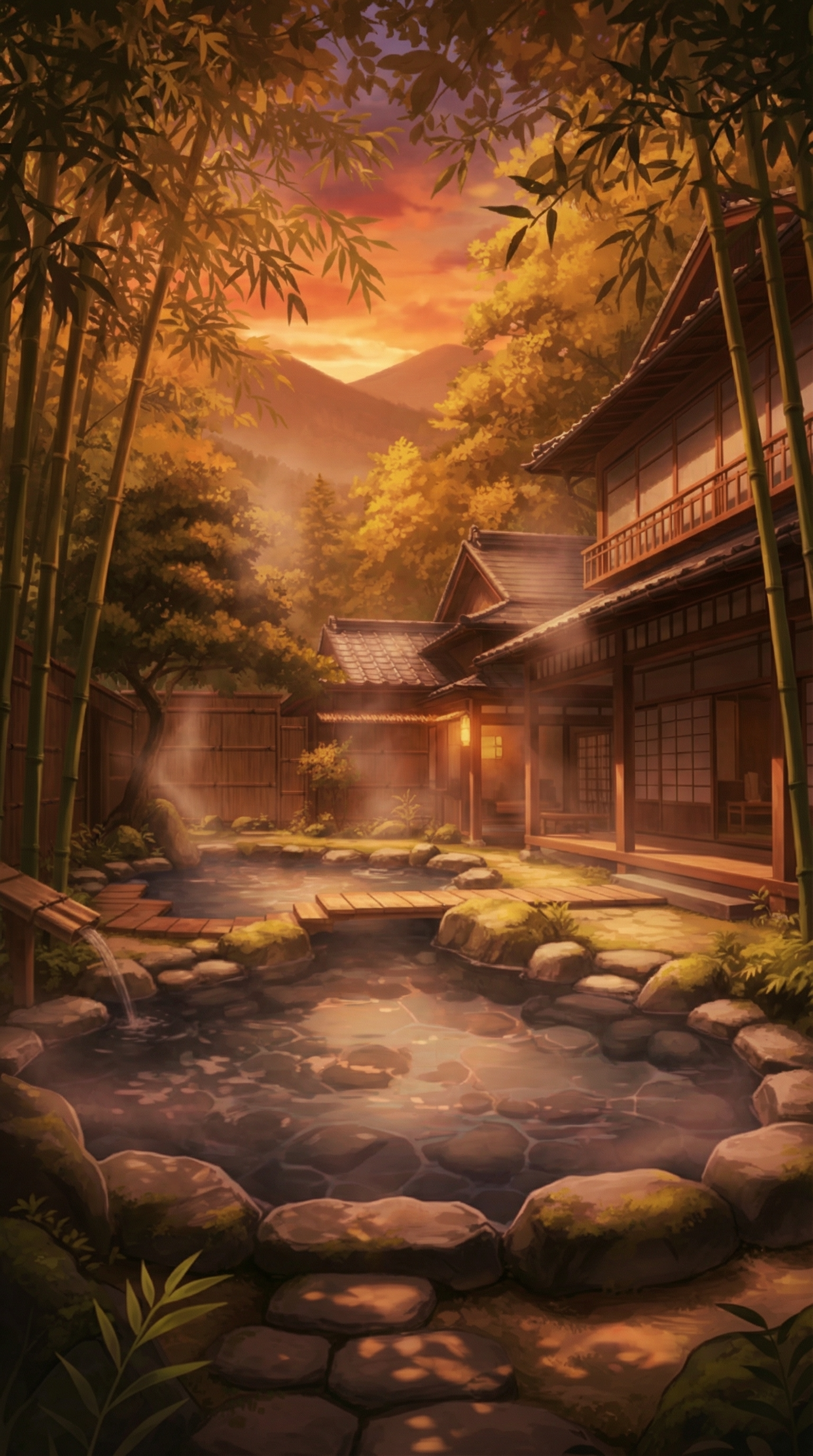 夕焼けの露天風呂と竹林の庭|黄昏の温泉背景