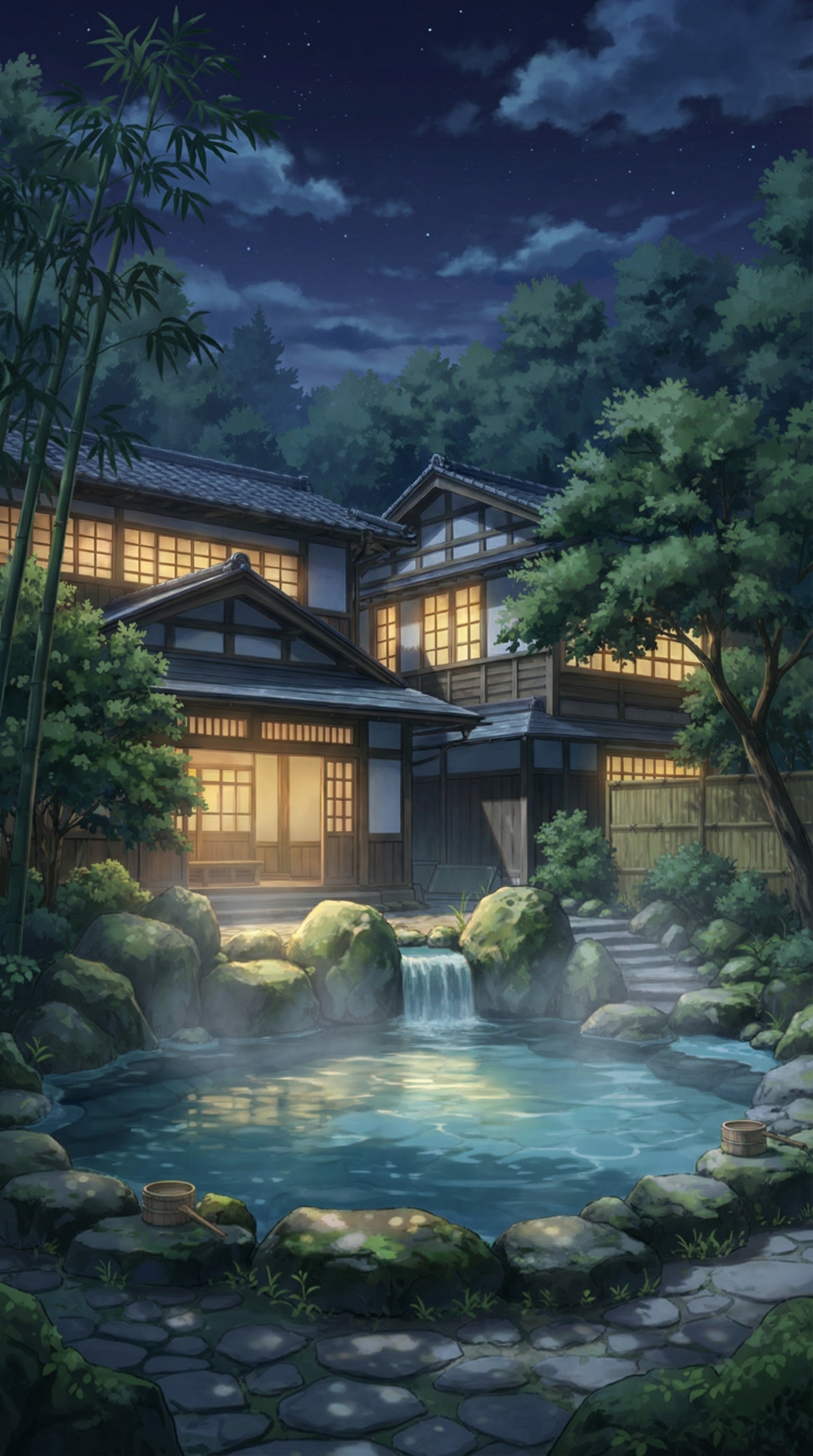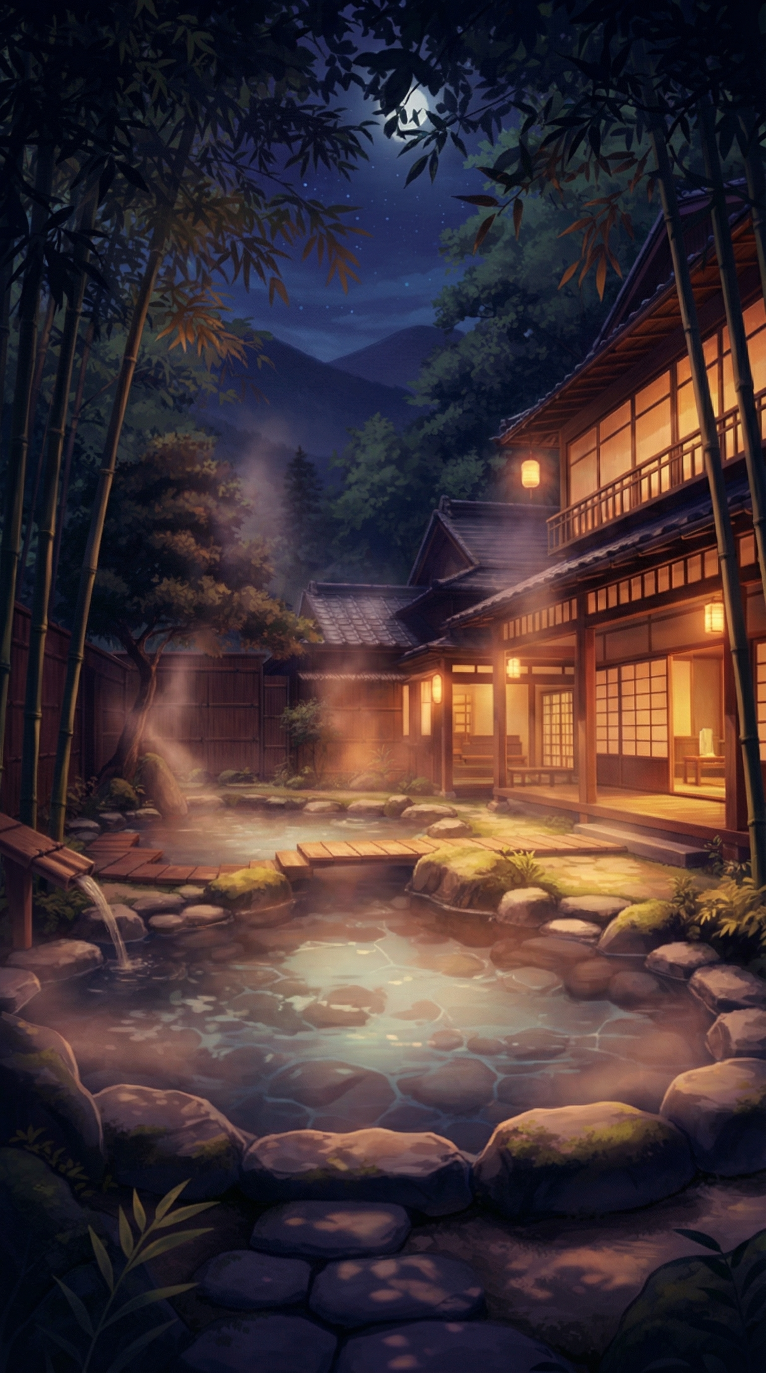 月光に照らされた露天風呂と旅館テラス|ナイト温泉背景