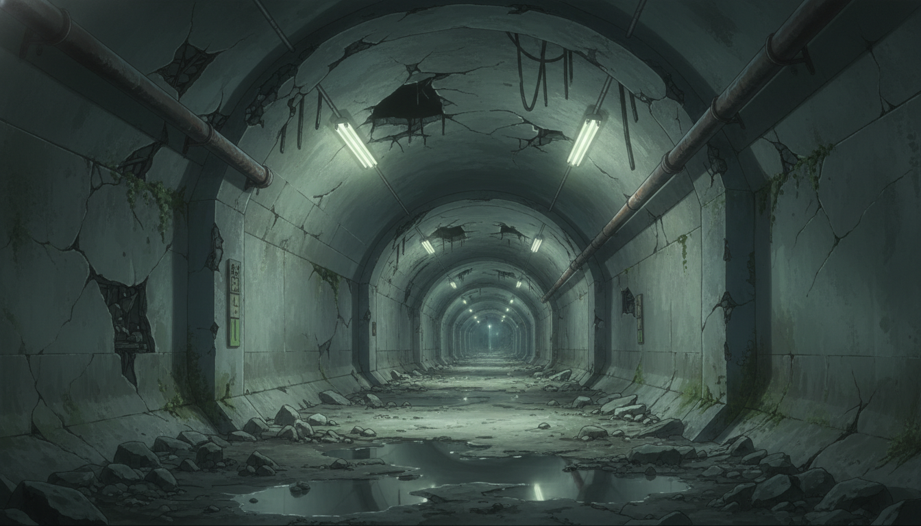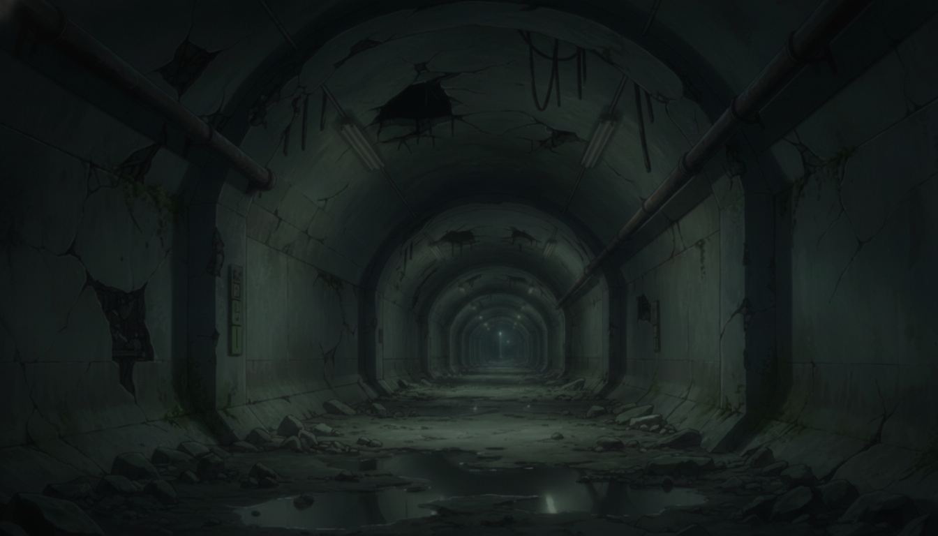 暗転した廃墟地下通路|視界を奪う恐怖のトンネル