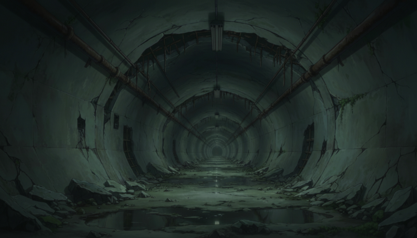 崩壊した地下通路背景|瓦礫と水たまりが残る廃墟トンネル