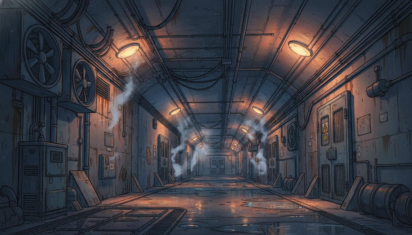設備が並ぶ地下施設通路|工業的な廃墟空間