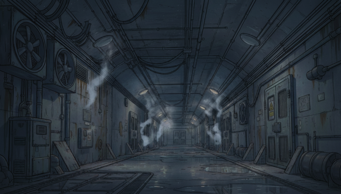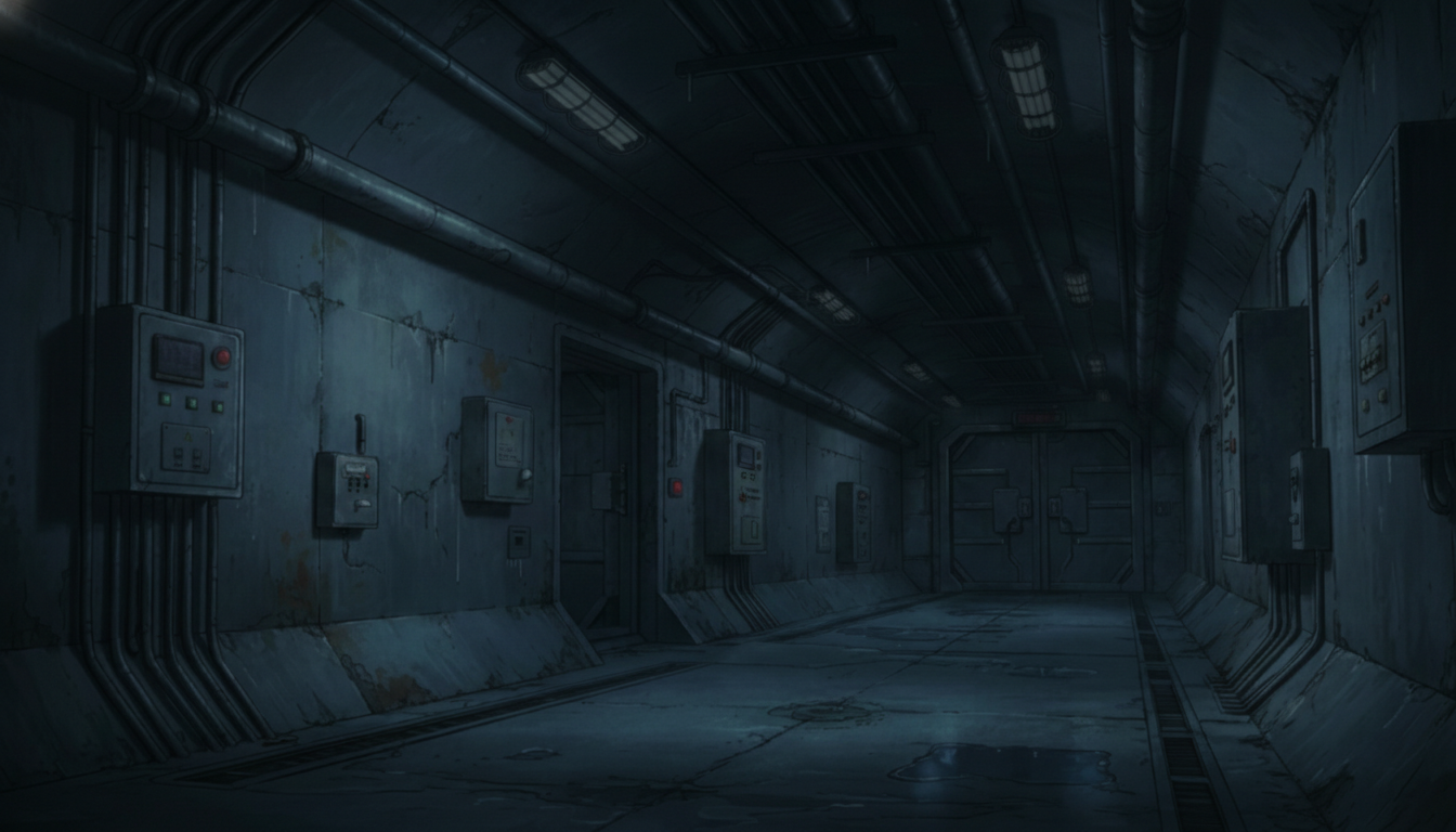 暗転した地下施設通路|緊張感が高まる非常時空間