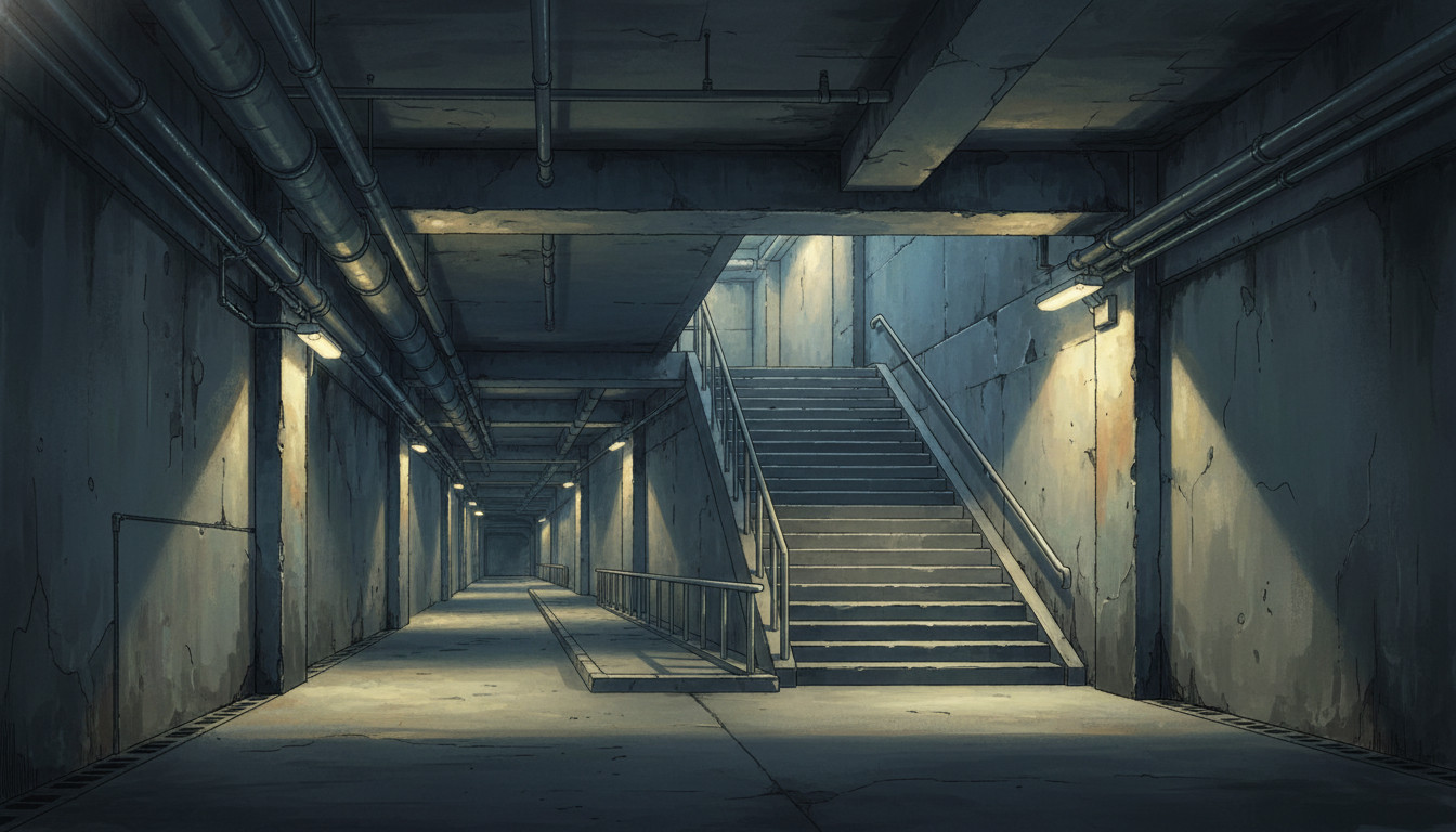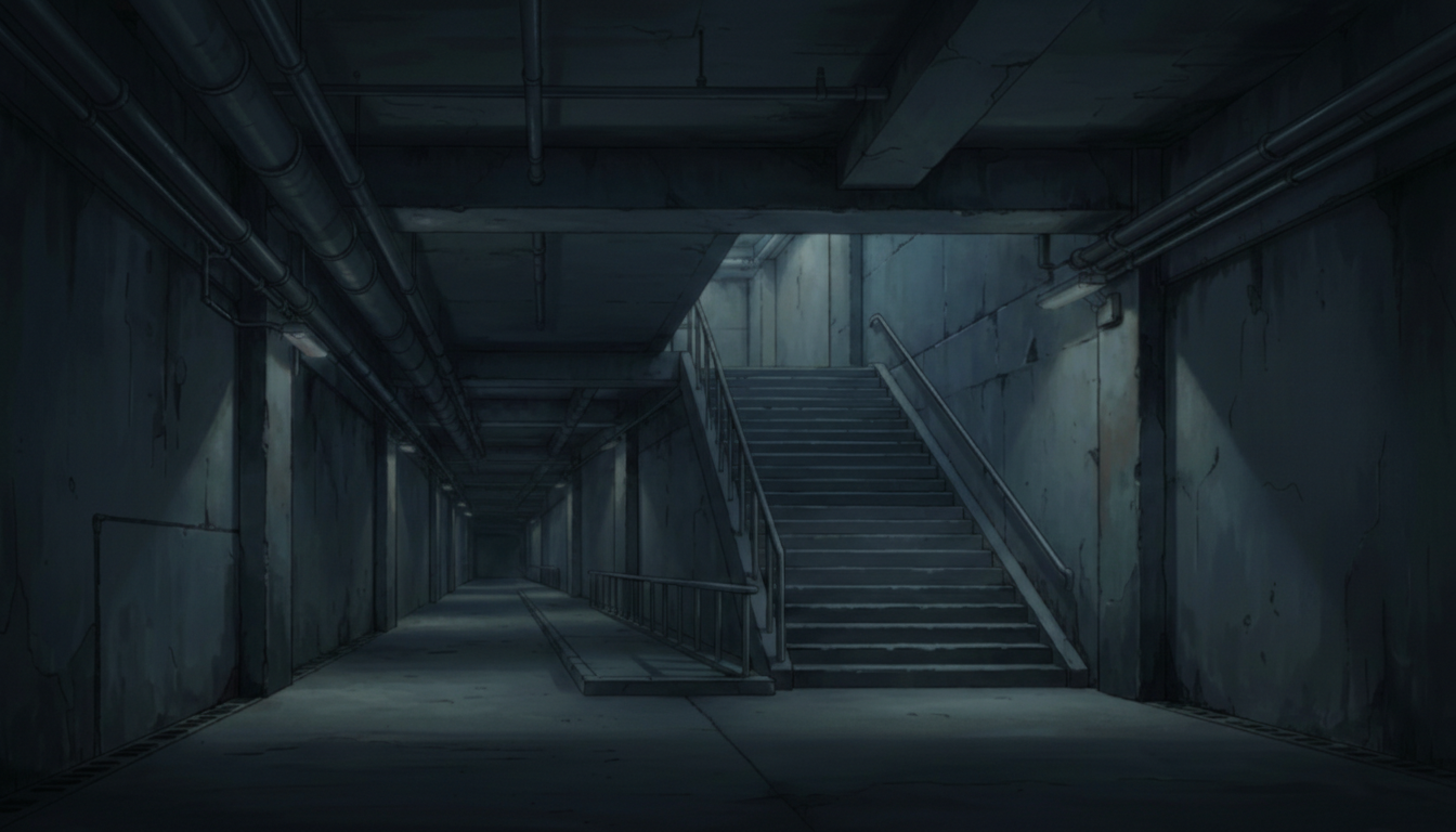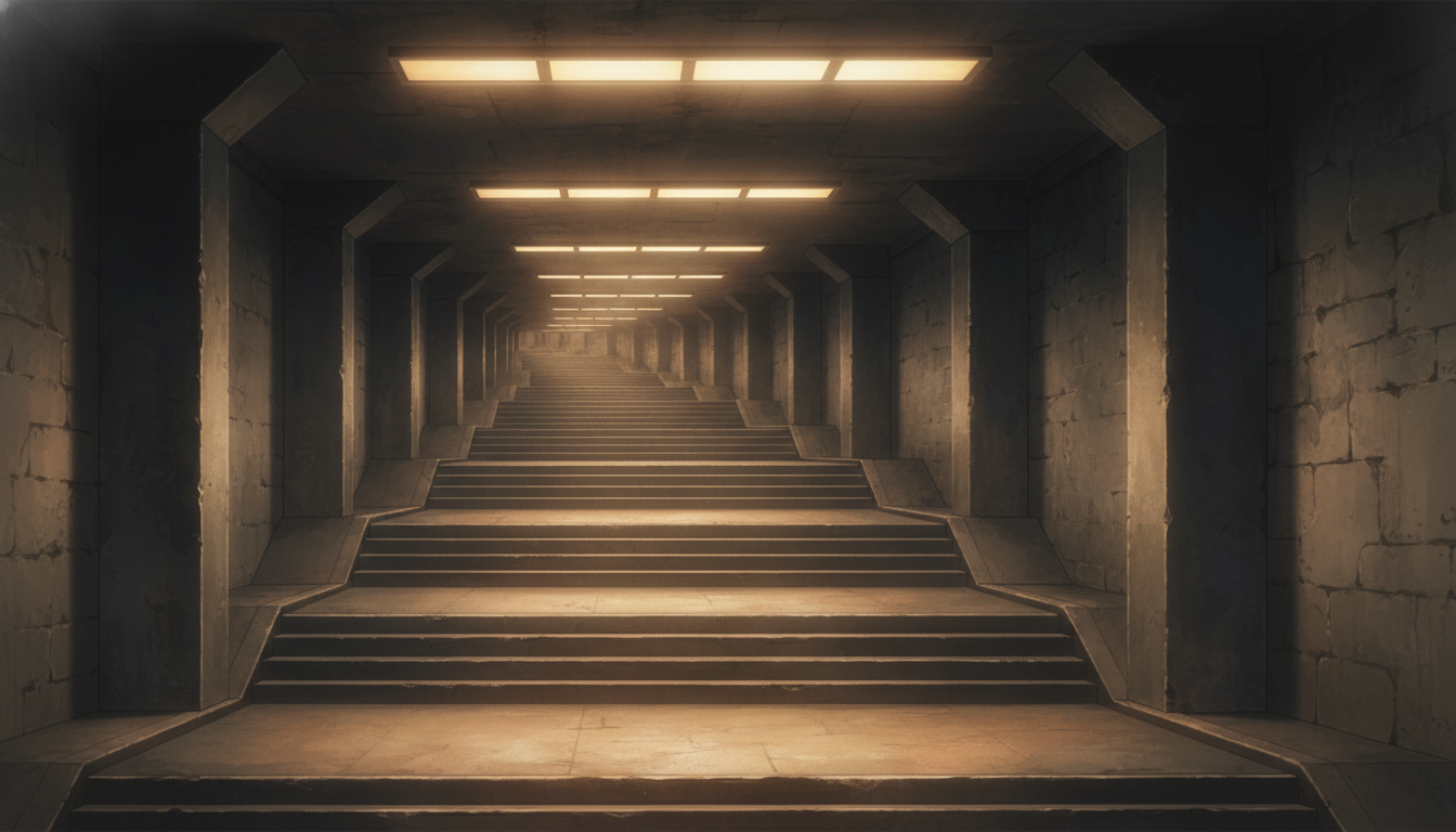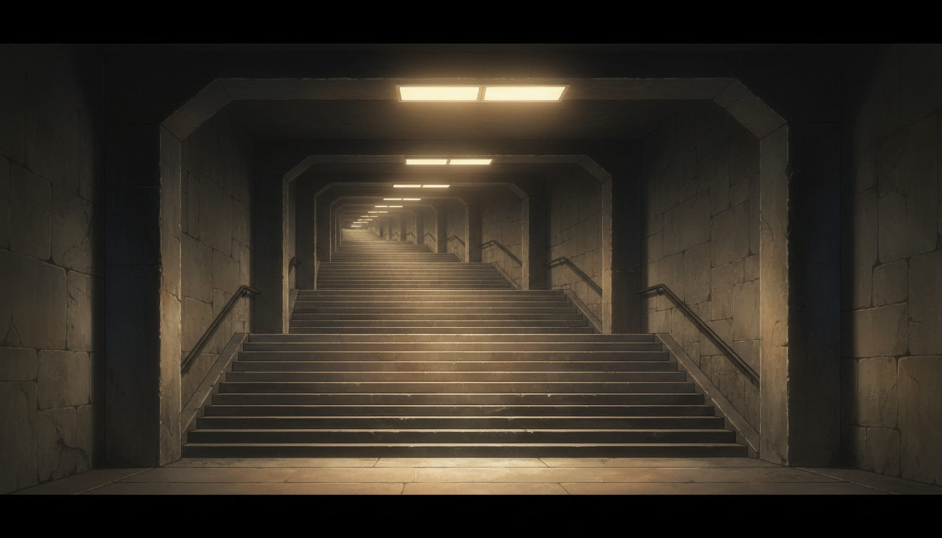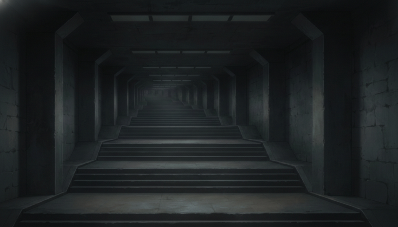 薄暗い巨大地下階段|深層へ続く閉鎖空間