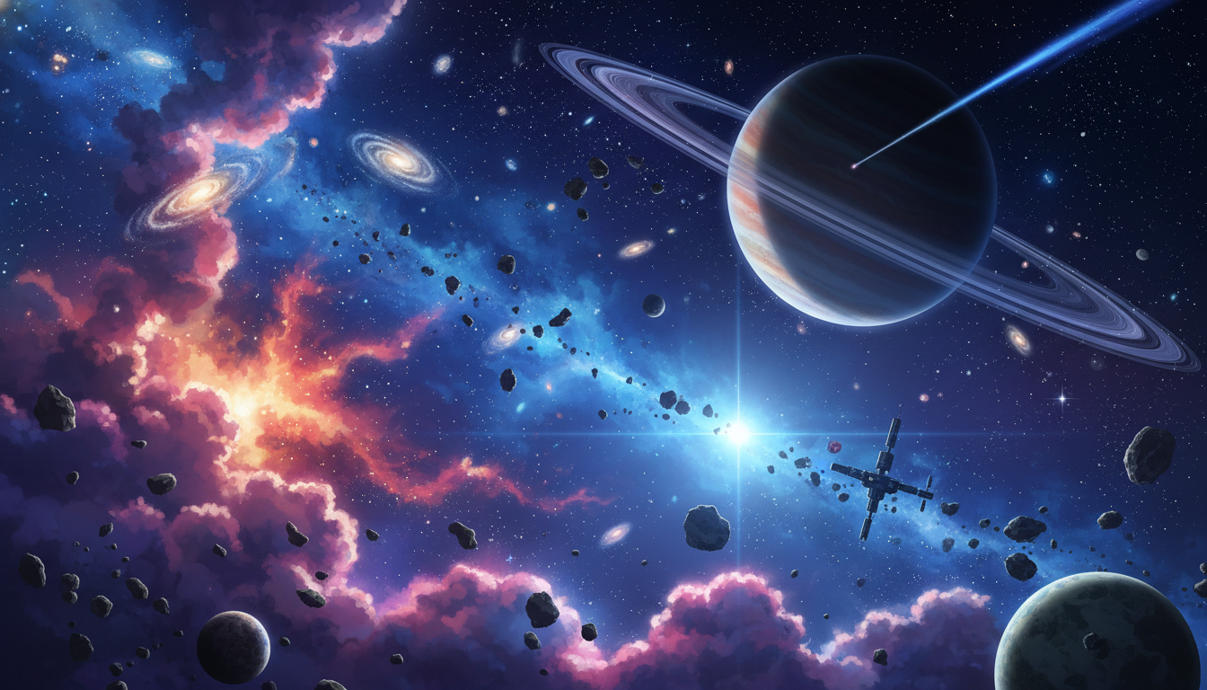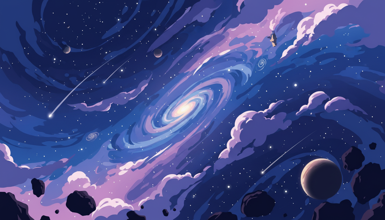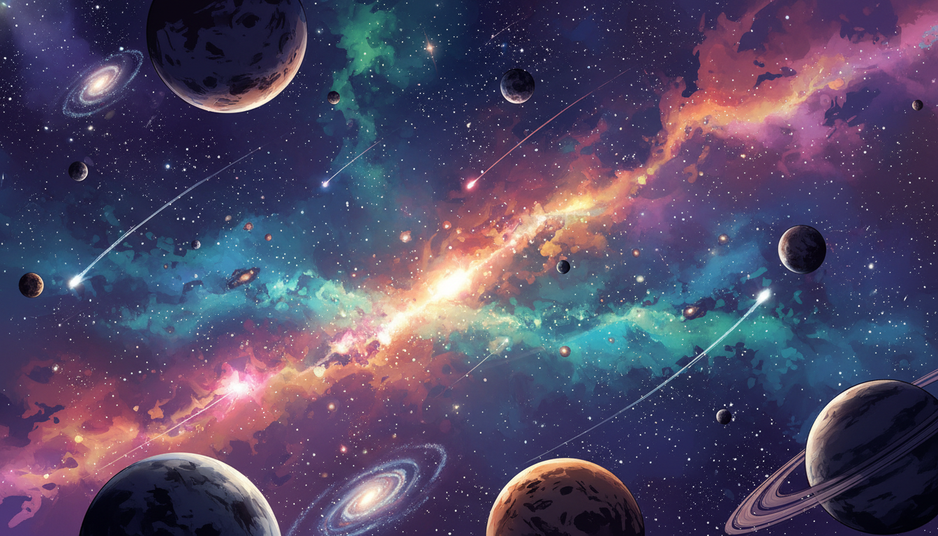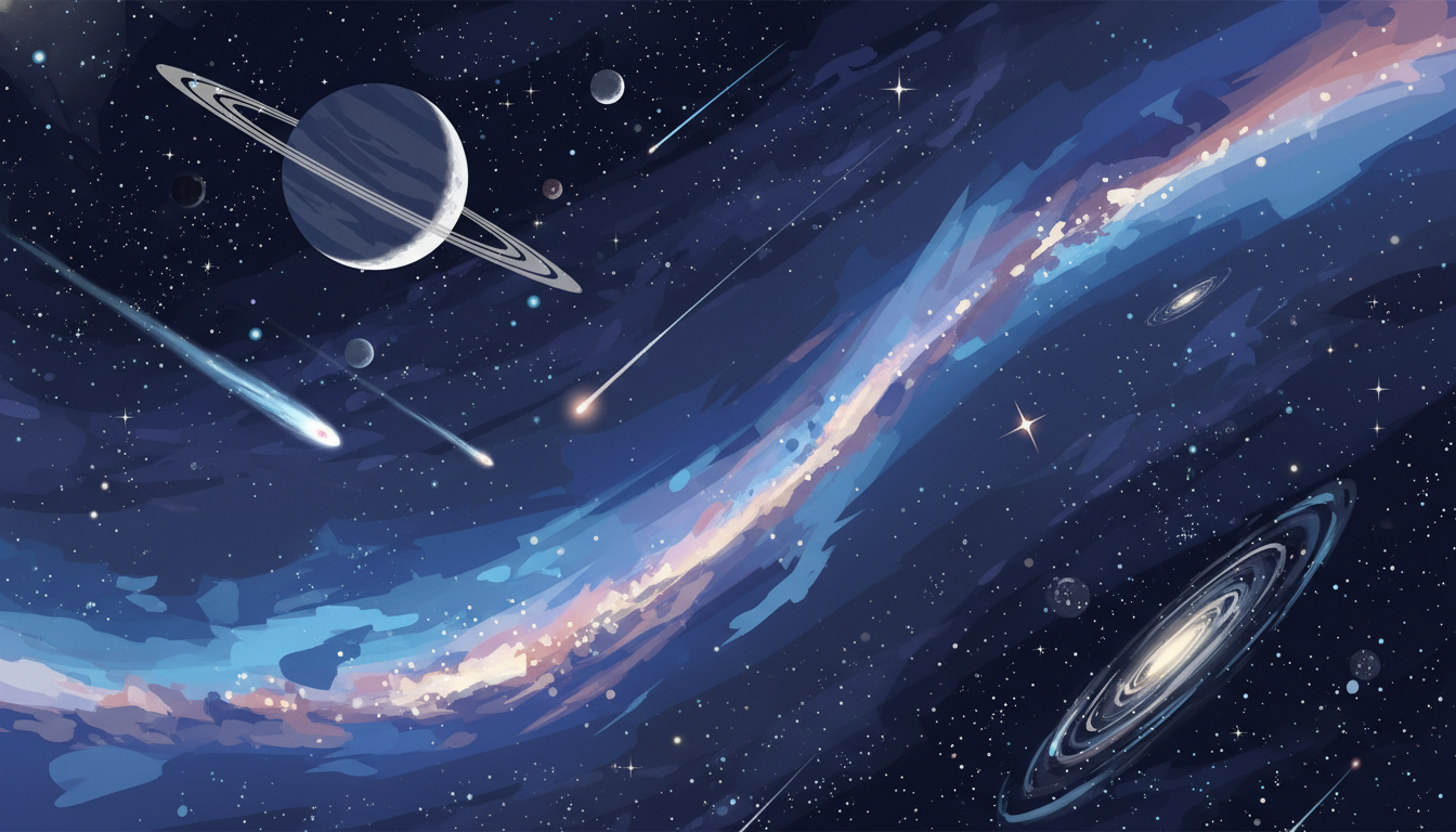 鮮やかな星雲と流星が、躍動感のある宇宙シーンを演出します。