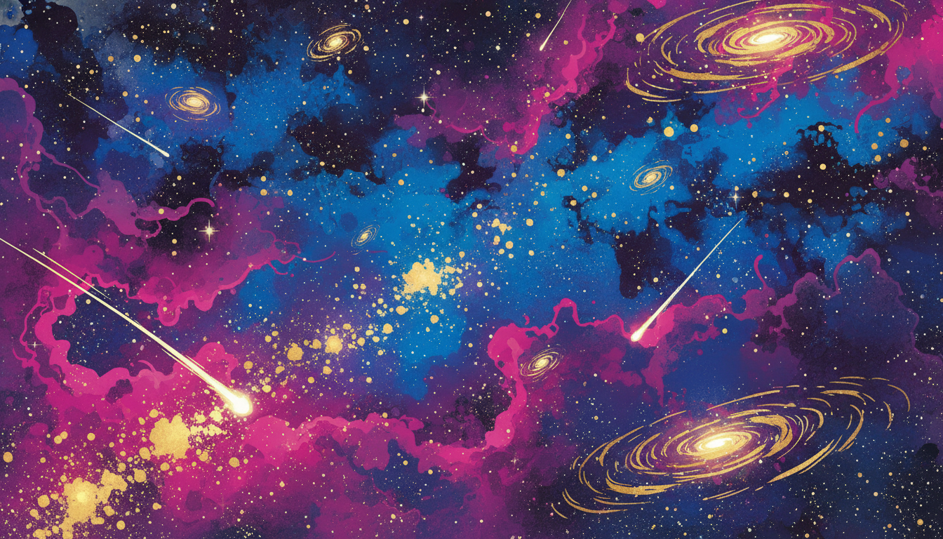 金色の粒子と銀河模様が、華やかで装飾性の高い宇宙背景を演出します。