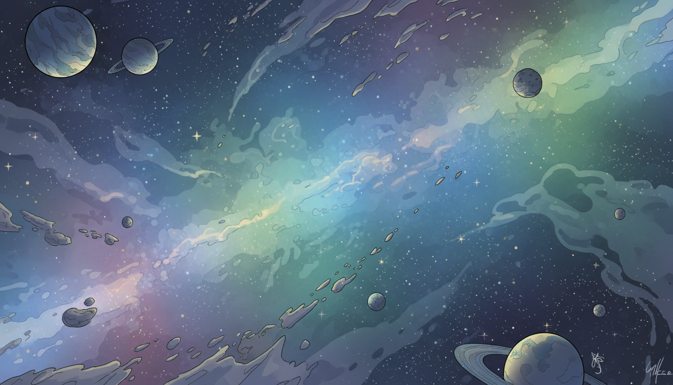 宇宙の背景イラスト素材を無料配布。16:9の横長構図でPC向け作品に使いやすい背景イラストです。漫画・Webtoonやゲーム背景として商用・トレース利用もOK!