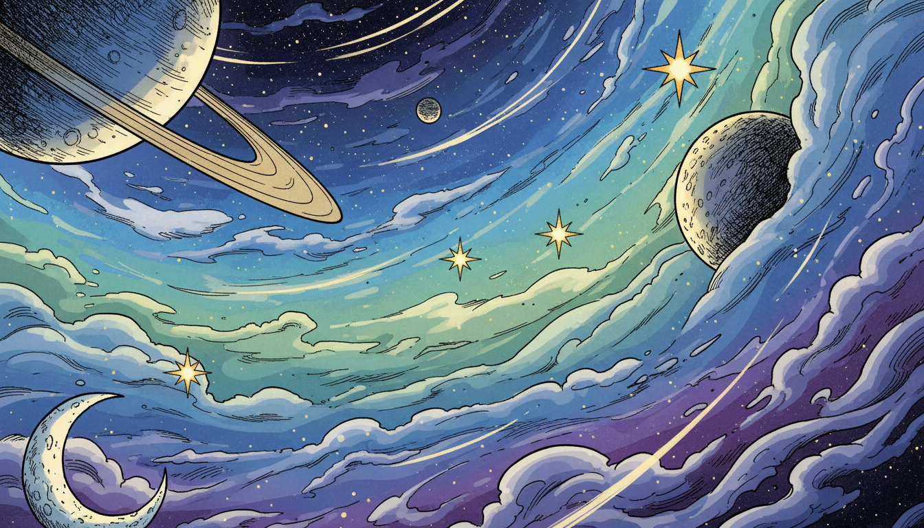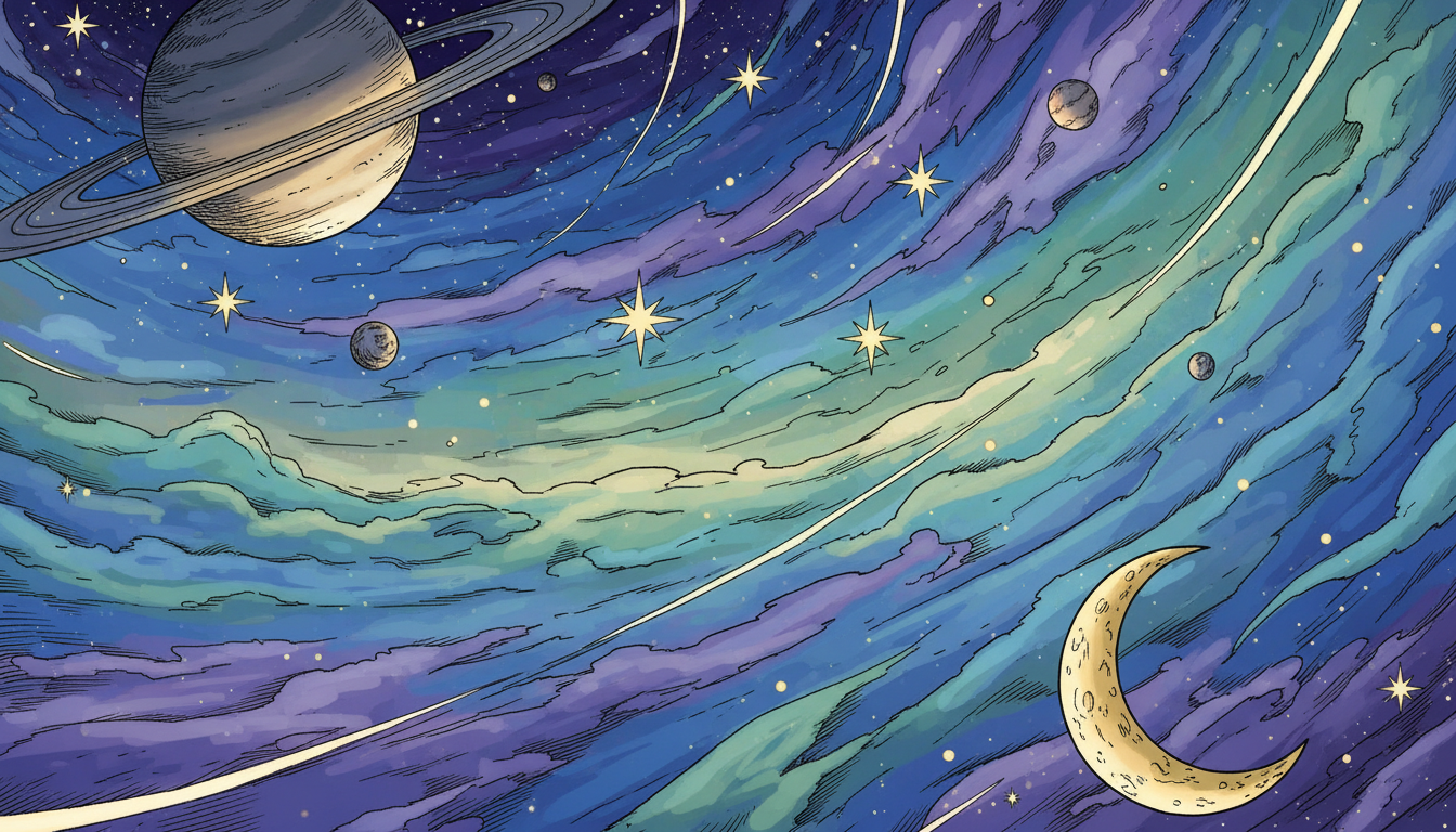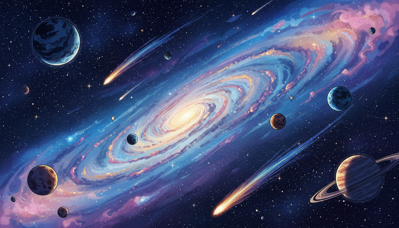 柔らかい色合いとデフォルメ表現が、親しみやすい宇宙背景を作ります。