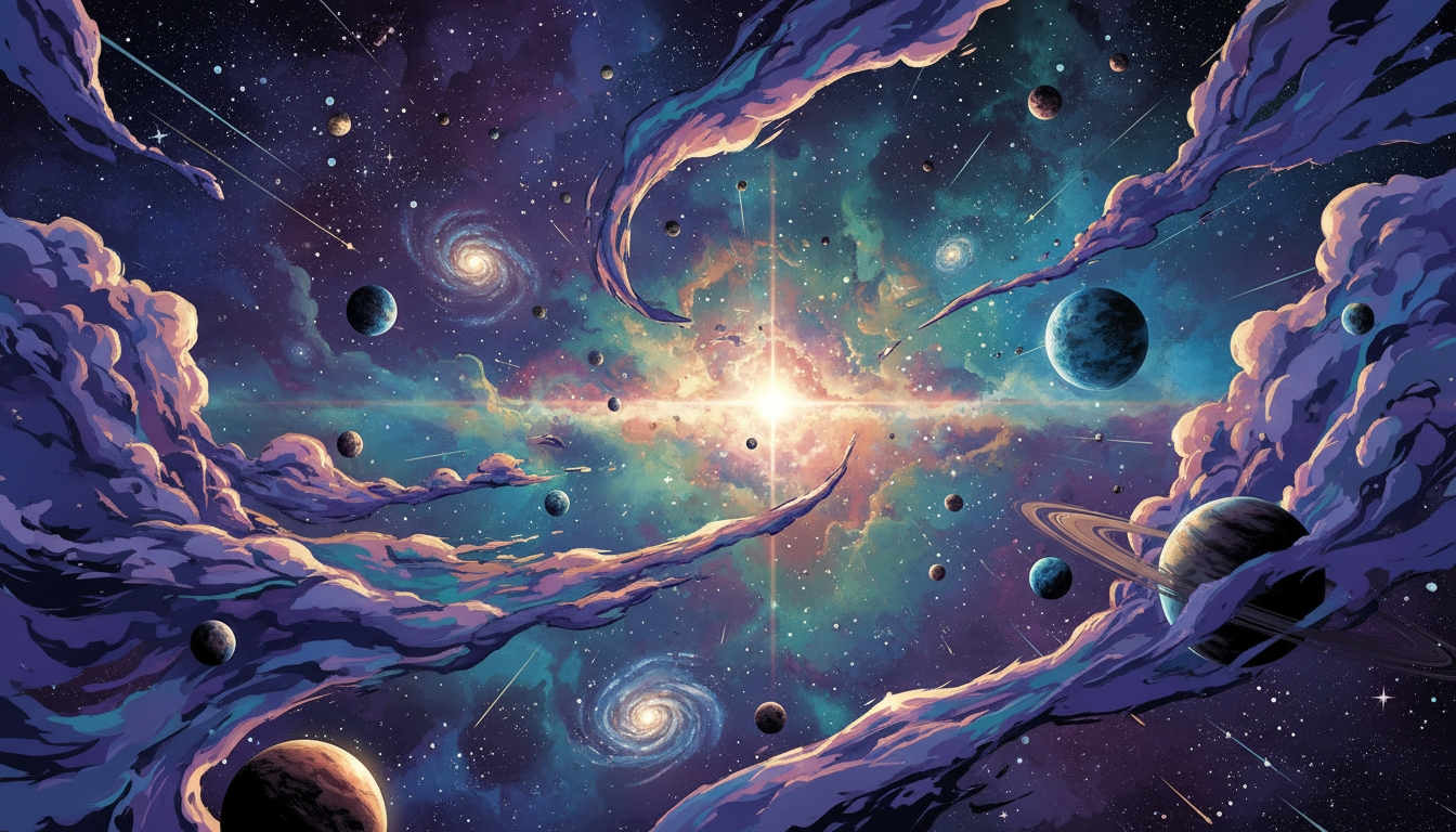 中央の光源が視線を集め、壮大な宇宙スケールを強調します。