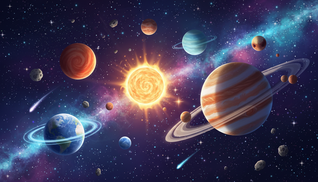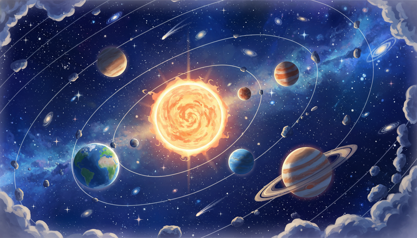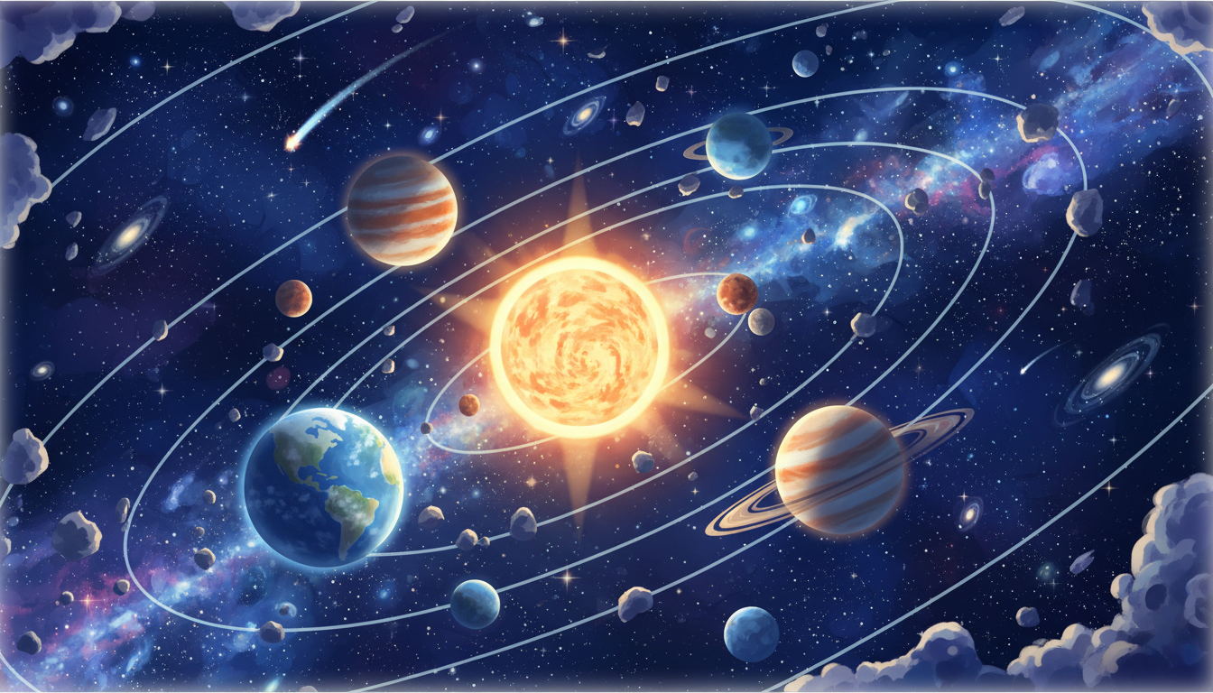 太陽を中心に惑星軌道が描かれ、物語や学習用途にも使いやすい宇宙背景です。
