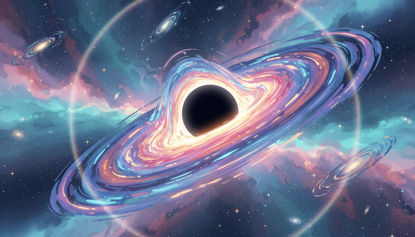 光を飲み込むブラックホールが、圧倒的エネルギーと緊張感を演出します。