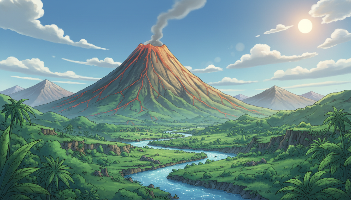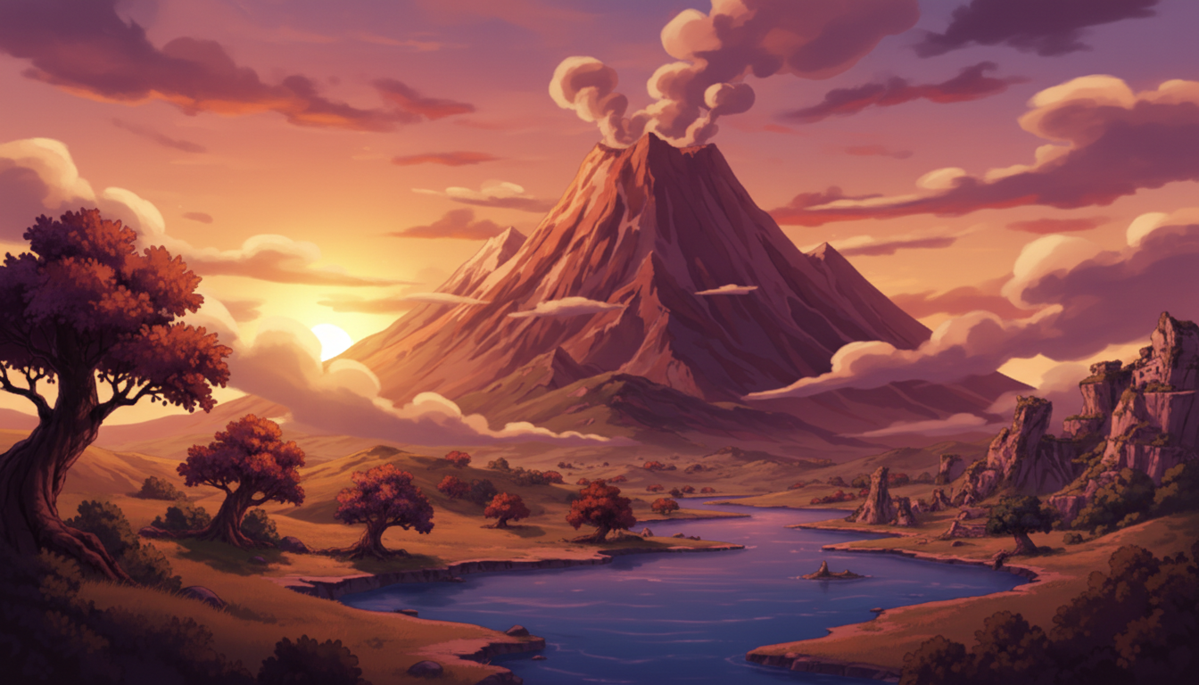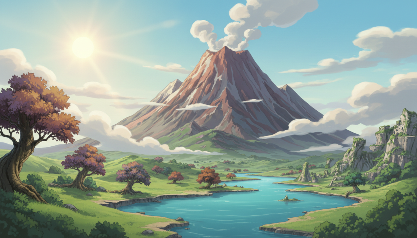 穏やかな自然と火山を組み合わせた構図で、ファンタジーやRPG背景に使いやすい素材です。