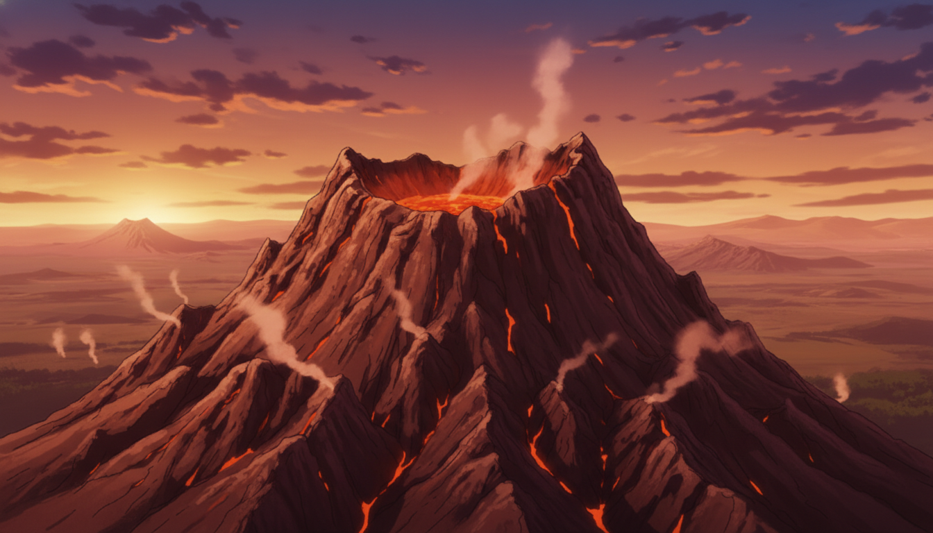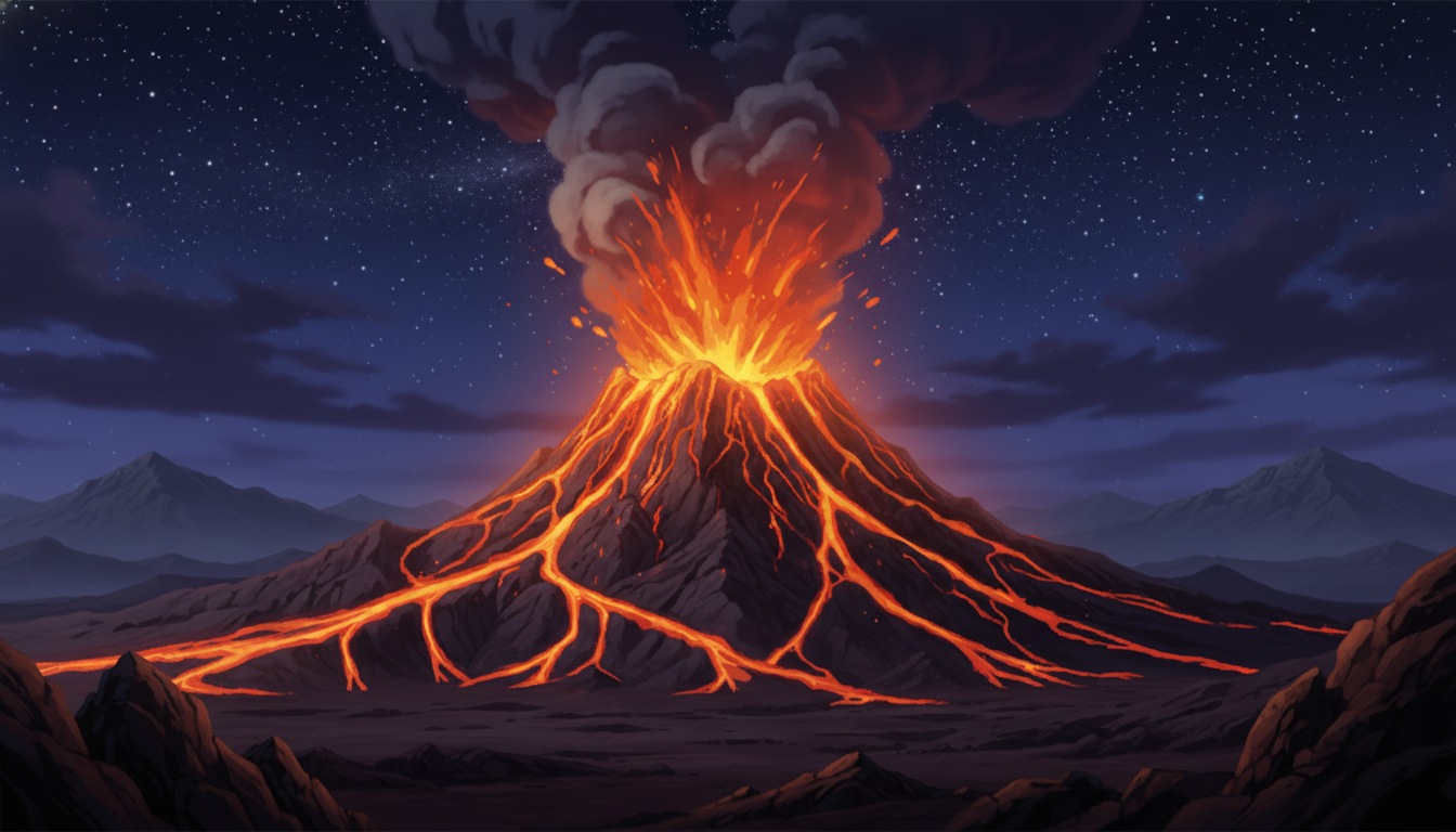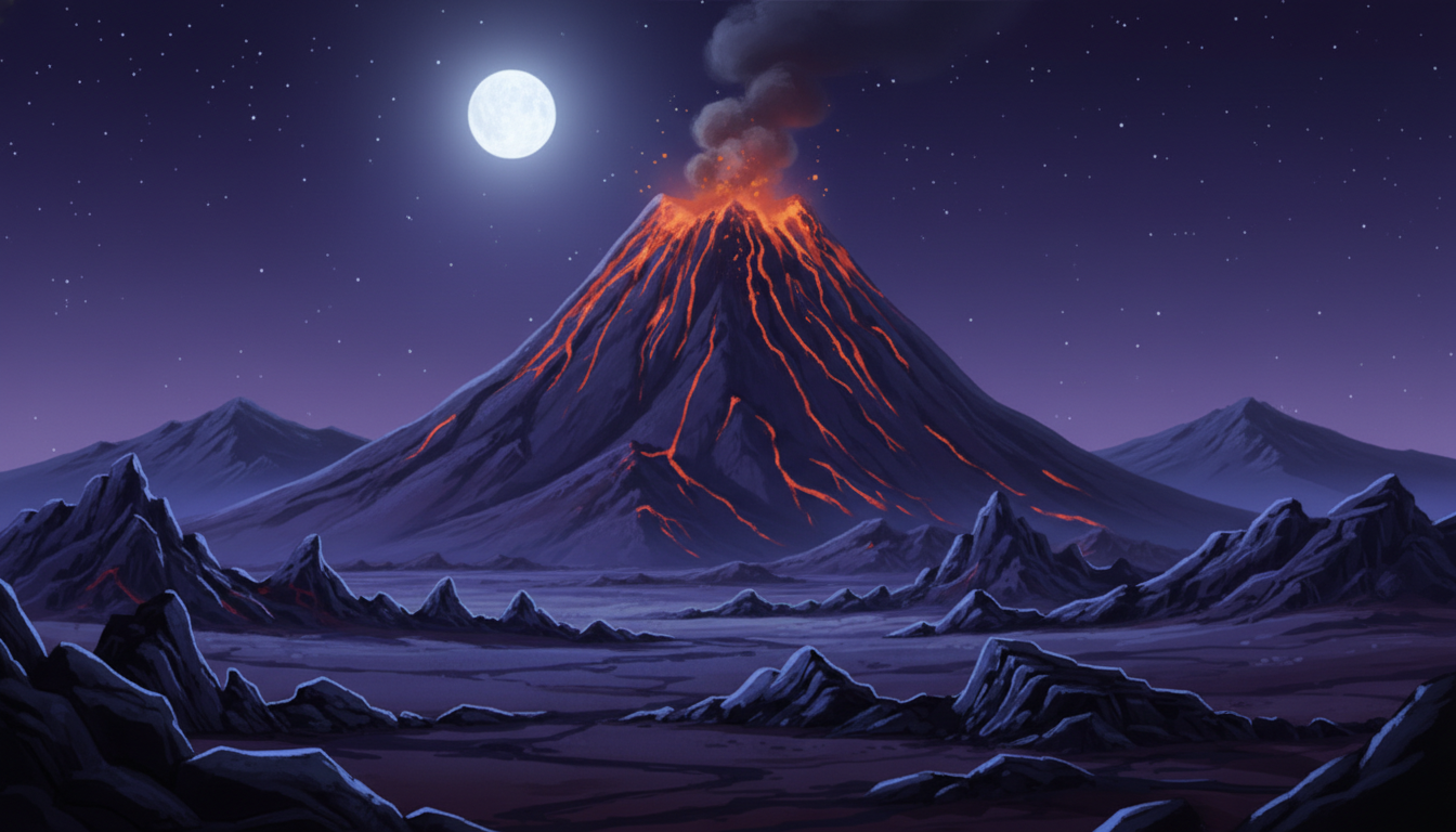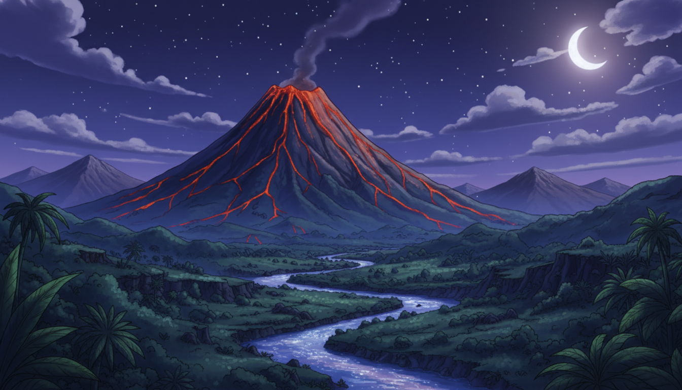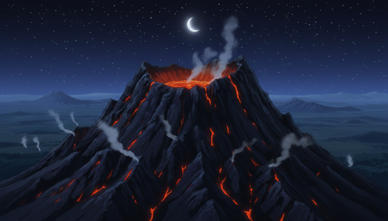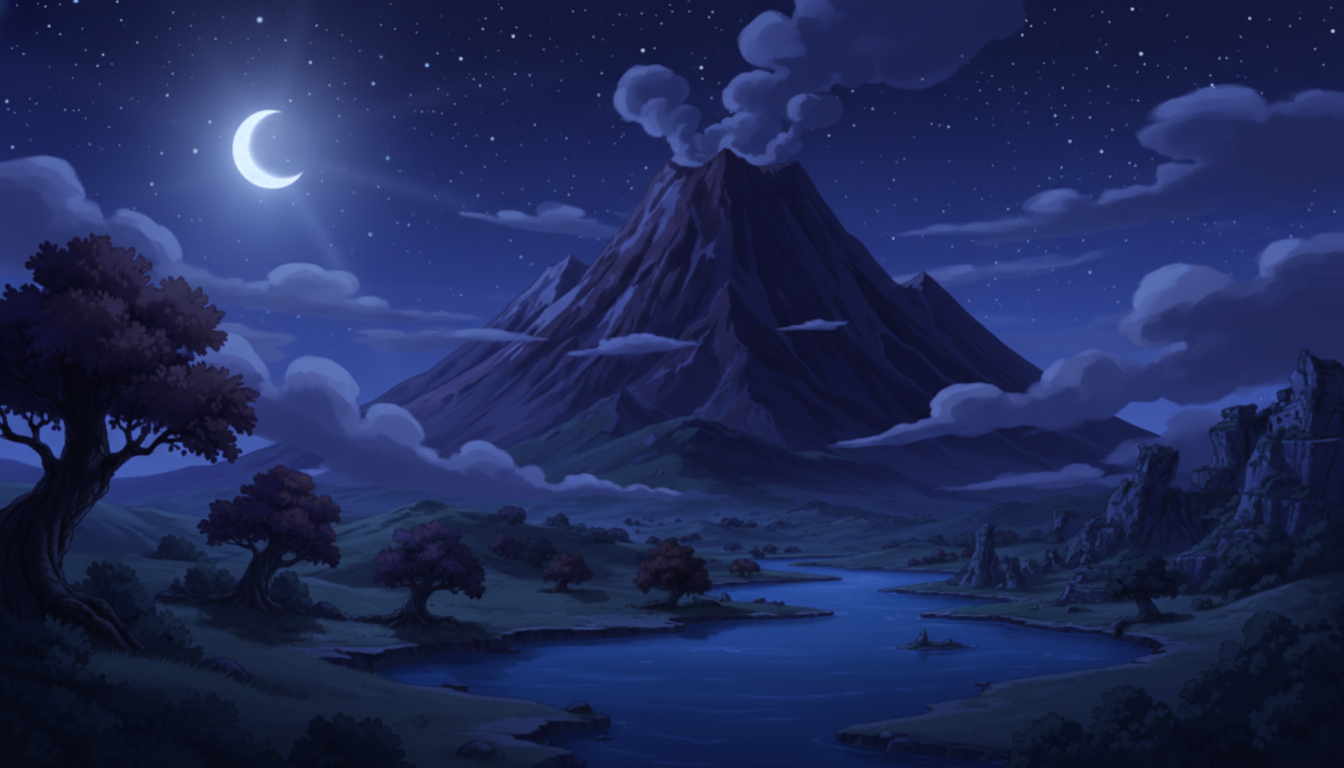 静かな夜と火山の存在感が、幻想的で落ち着いた背景を作り出します。