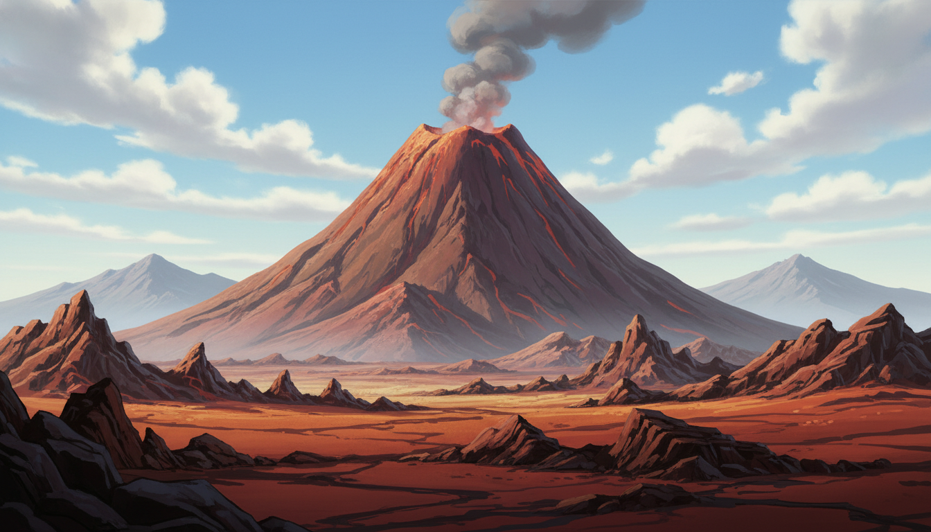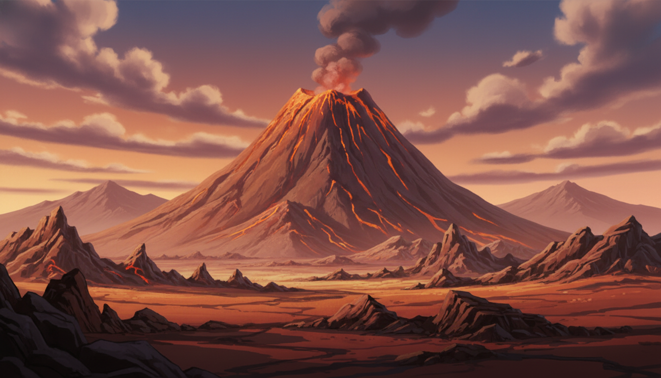 火山の背景イラスト素材を無料配布。16:9の横長構図でPC向け作品に使いやすい背景イラストです。漫画・Webtoonやゲーム背景として商用・トレース利用もOK!