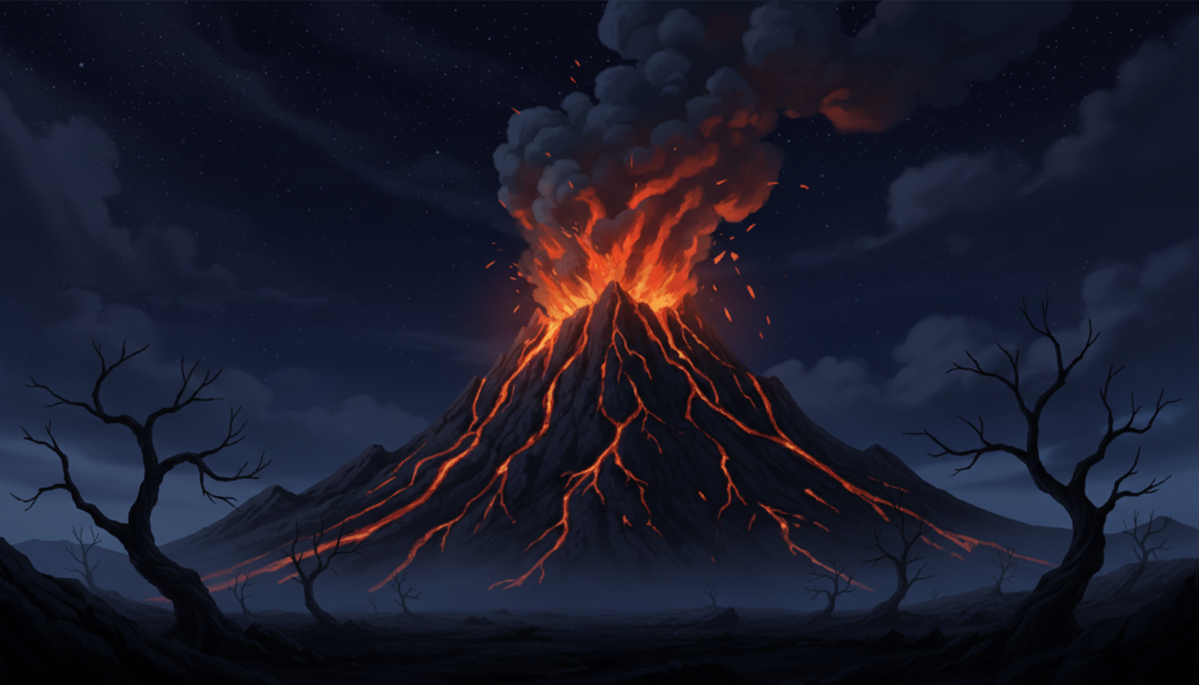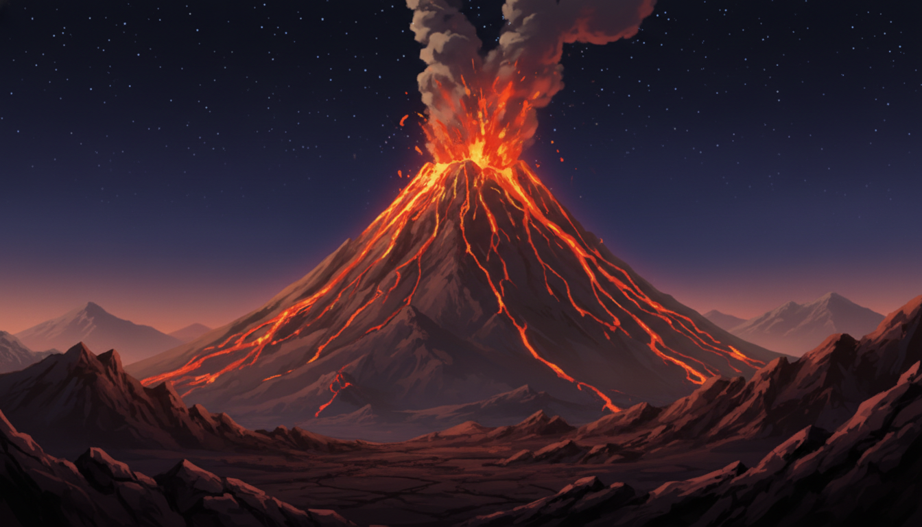 夜空に映える溶岩の赤が、ファンタジーや冒険シーンに最適です。