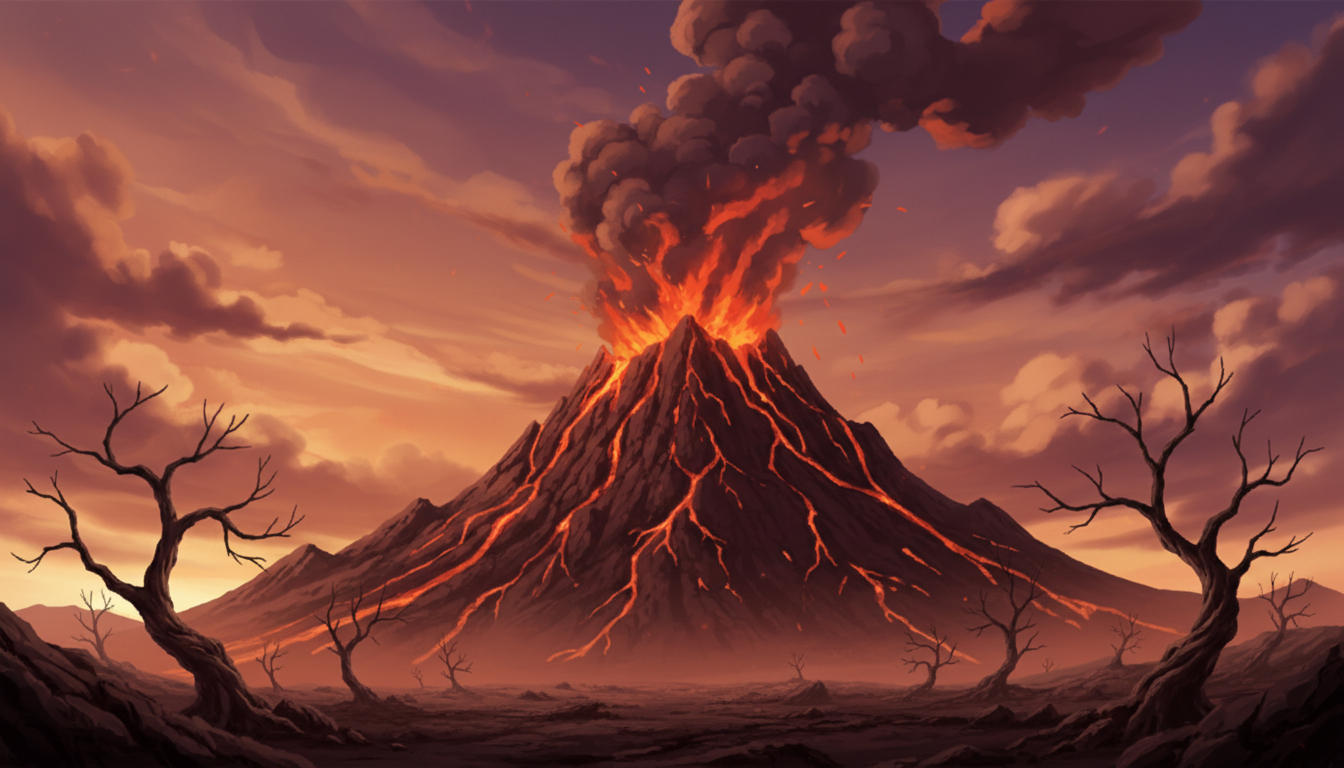夕暮れの色彩と噴火の迫力が、物語性の高いシーンを演出します。