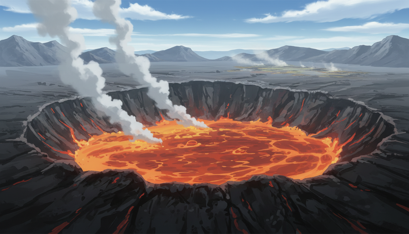 火口いっぱいに広がる溶岩湖が、圧倒的なスケール感を表現しています。