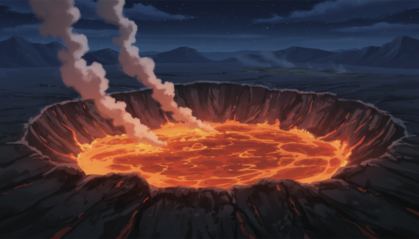 暗闇に浮かび上がる溶岩湖が、静かで緊張感のある雰囲気を作り出します。