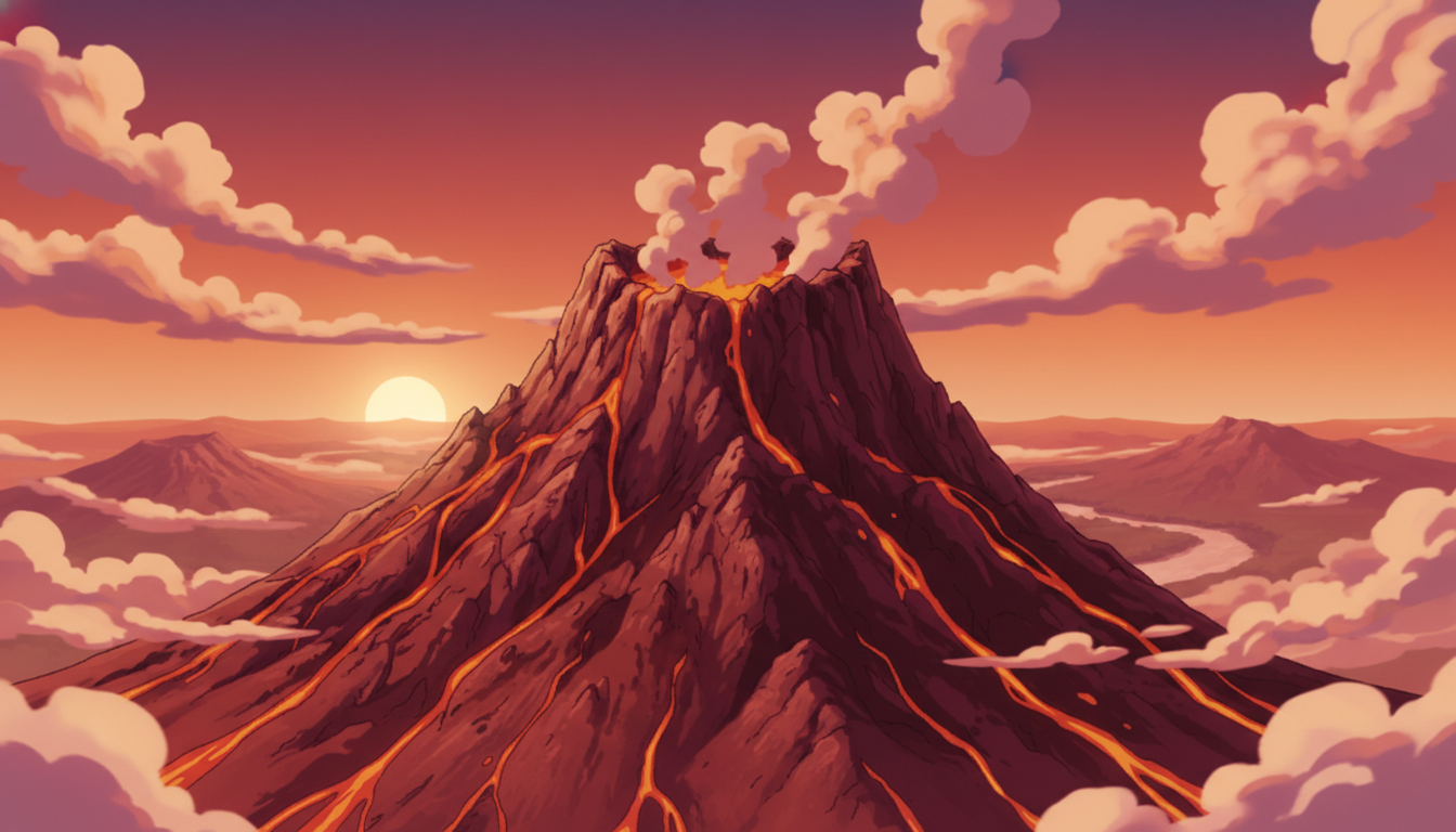 夕焼けに包まれた噴火|火山のファンタジー背景