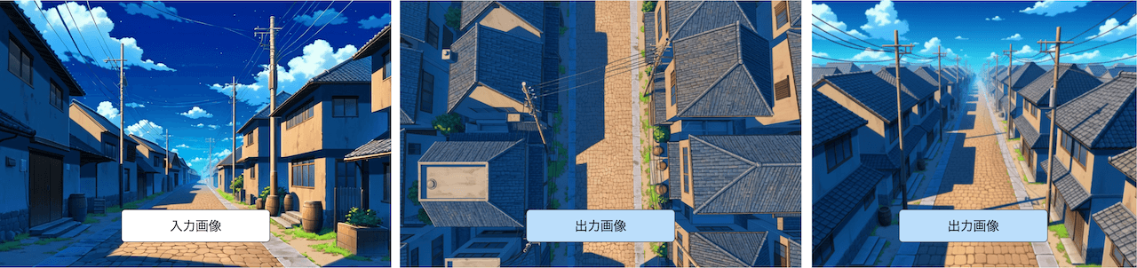 「俯瞰で」「ローアングルで」など、具体的に指示するのがポイント。また、構図を指示するだけではなく、「建物の一貫性を保ったまま」などの追加の指示を入れることでより安定的な構図の変更をすることができます。 - 生成と確認