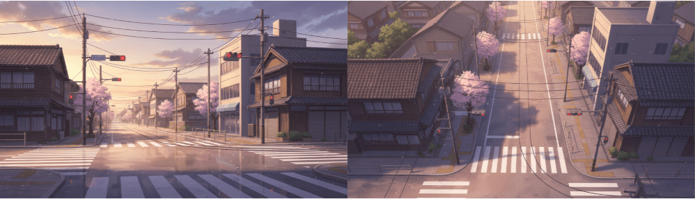 AIが元のイラストをベースに一貫性を保ちながら生成してくれるため、建物・街並み・自然などの要素を極力崩さずに、カメラワークを変えたような新しい背景を素早く手に入れることができます。