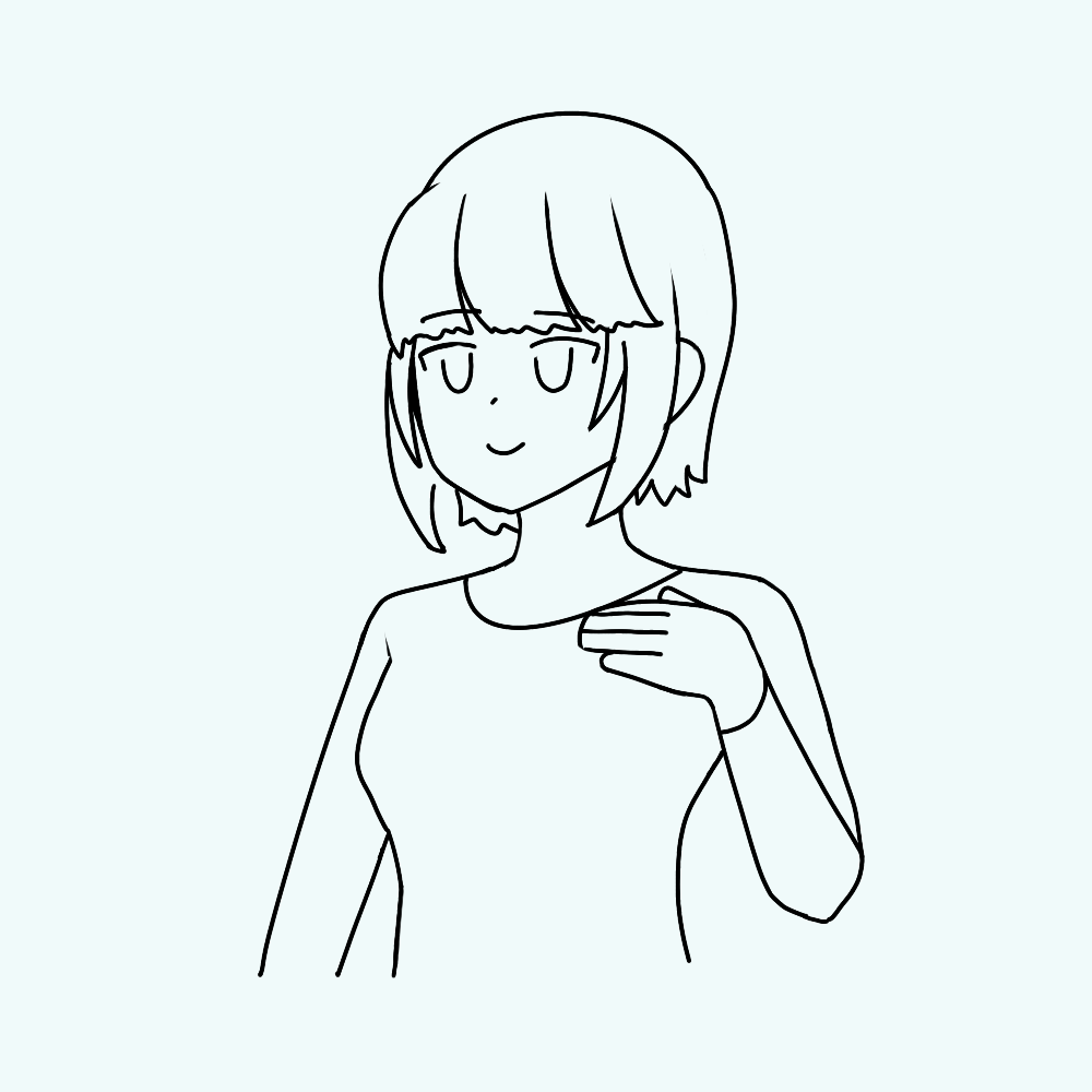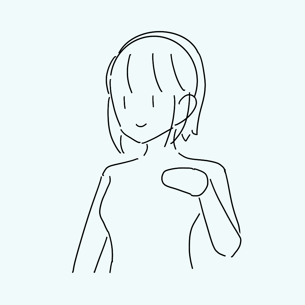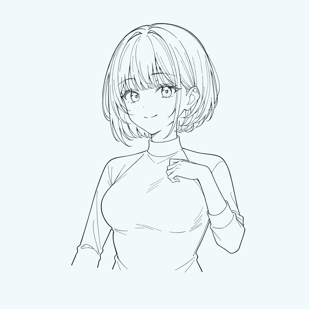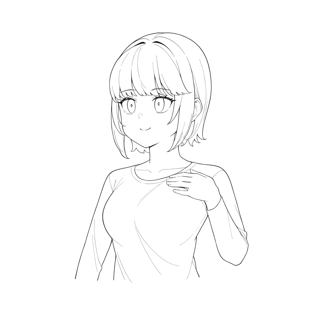 プロンプト:solo, breasts, smile, short hair, simple background, white background, closed mouth, upper body, hand up, sketch o, split mouth, clothes,