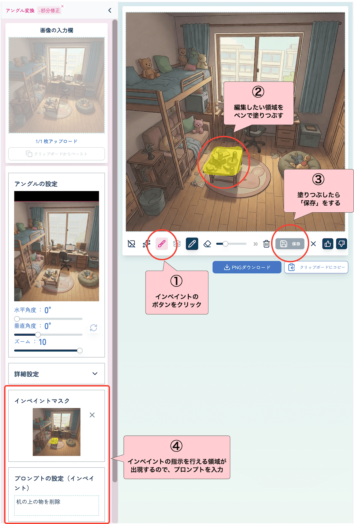保存ボタンを選択して、インペイントしたい領域を確定させてください。一回保存しても修正することは可能です。