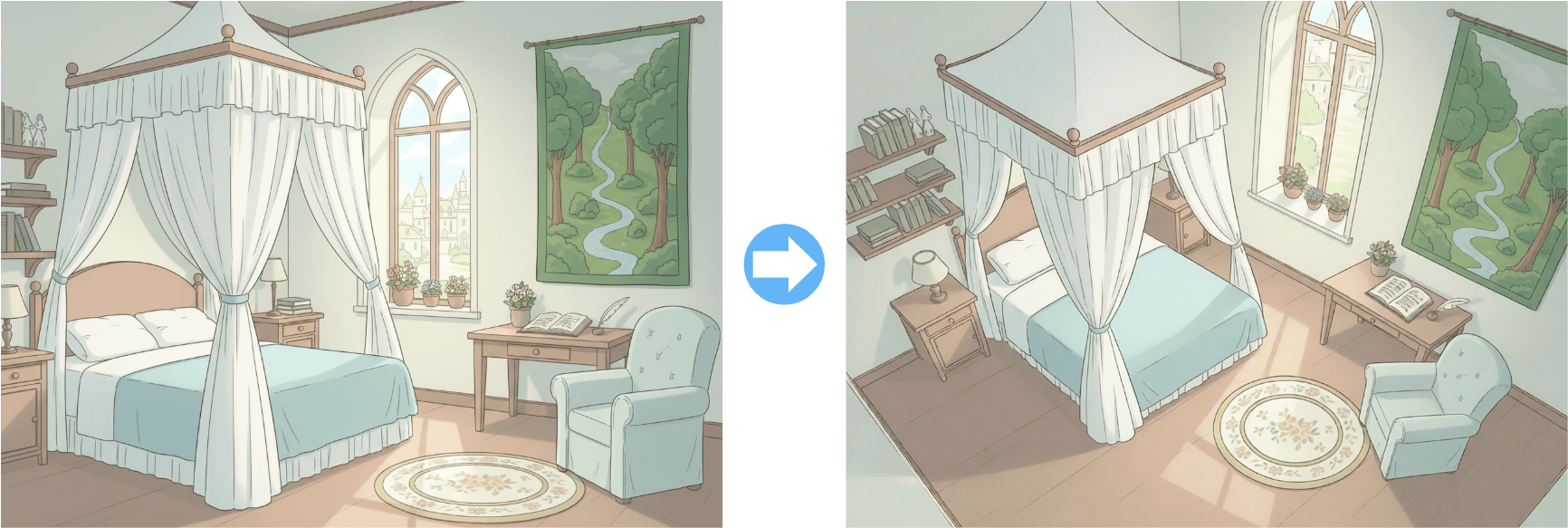 In manga and anime production, the angle (point of view) of background art has a huge impact on a work’s sense of immersion and dramatic expression. However, redrawing the same location from multiple angles is one of the most time-consuming and labor-intensive tasks in background production.