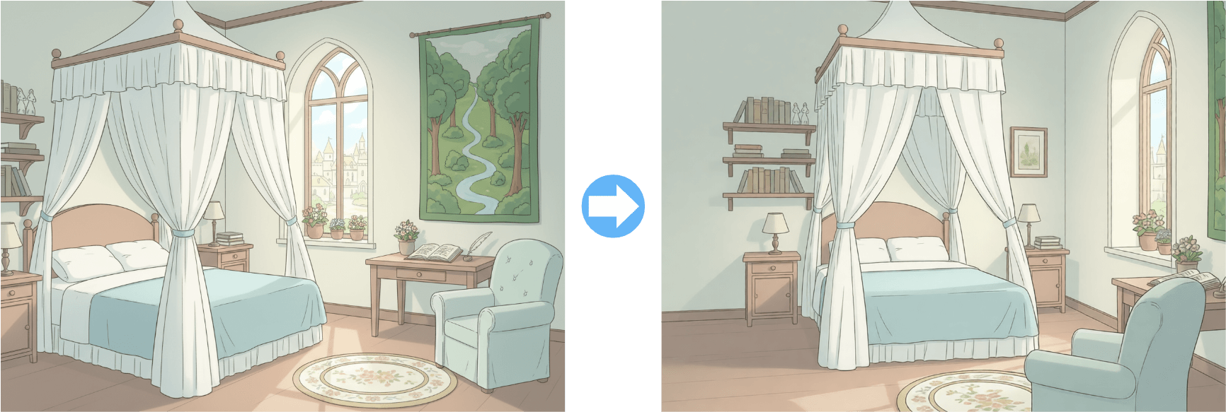 copainter’s Camera Angle Control AI generates backgrounds from new viewpoints based on existing background artwork—while preserving the original spatial structure and world setting.