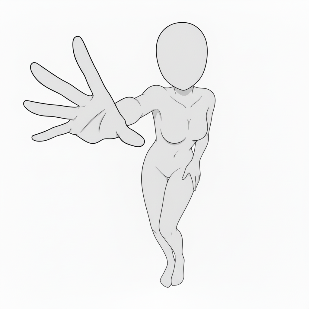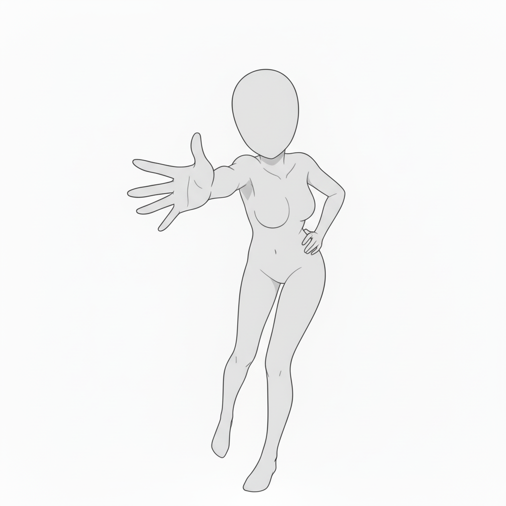 A dynamic, impactful pose—touch/beckon/energetic openings.