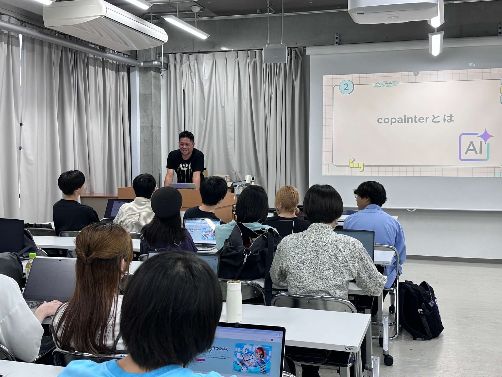 In early October, we held a manga production class using copainter, a creative-support AI tool, in Kyoto University of the Arts’ Product Design course “Project Practice Seminar.” Students brought their laptops and participated in a hands-on workshop where they used AI as an assistive tool through the full workflow: rough sketch → line art → coloring → finishing. This article summarizes the session based on the lecture slides and photos from the day (images on this page).