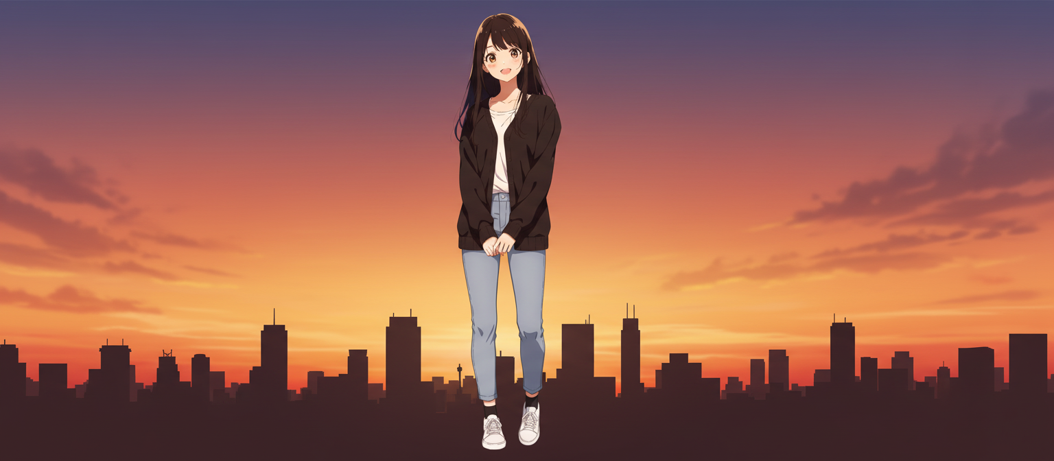 Prompt used: Create a wide header image centered on this character. The background should be a sunset sky and a city silhouette (no white areas). Keep the character’s pose and expression unchanged.