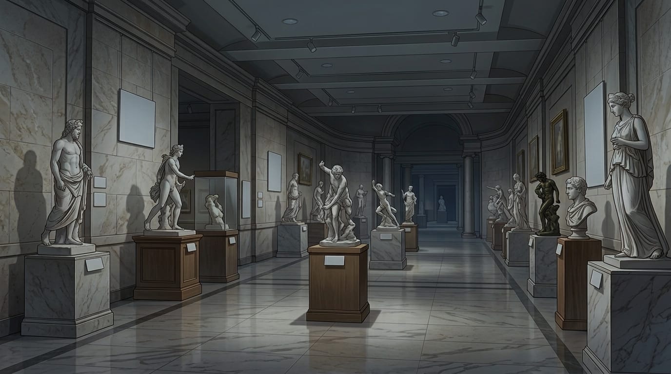 - Nighttime Large Sculpture Exhibition Hall with Classical Statues | Dark Gallery Background Illustration